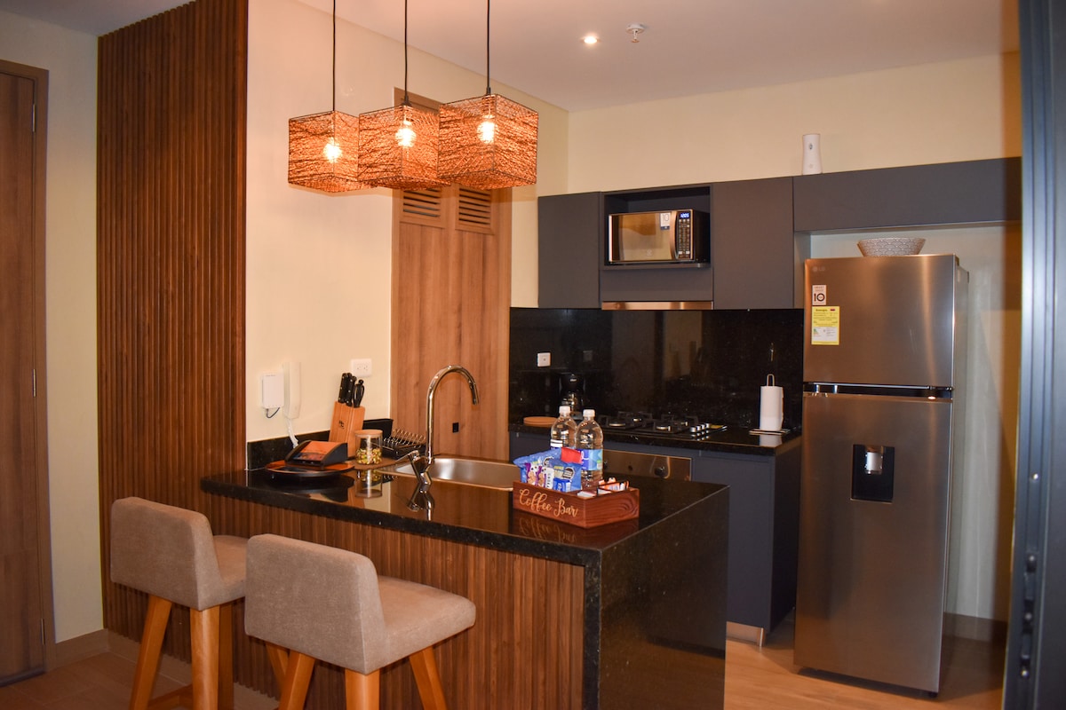 The H2 Condominium has the benefits of Hotel life with your own fully equipped condo, connected to the Hyatt Regency, the BocaGrande Mall, and a Supermarket for easy and comfort living. Sadržaji u H2 su spektakularni sa beskonačnim bazenom, fitnes centrom, parnim kupatilom, saunom, zonom za roštilj i parking mjestom. Nisu povezani sa hotelom Hajat. Kolumbijski zakon o turizmu br. 2068: 81458