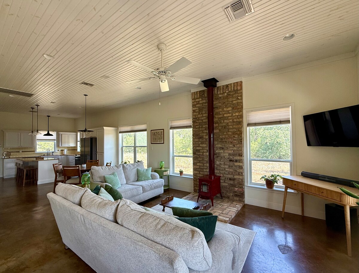Opustite se u ovoj modernoj brvnari u kojoj se priroda susreće s udobnošću. Uživajte u interaktivnom doživljaju sa ljubaznim domaćim životinjama željnim kućnih ljubimaca i poslastica. Uživajte u pogledu na mirno jezerce, krave na ispaši i konje. Istražite staze na osami. Roletne za filtriranje svjetla, klima-uređaj i Starlink Wi-Fi. Izgrađeno 2023. godine. Imamo prasiće, mini-koze, krave, konje, magarce i crnog labradora koje možete da pozdravite U blizini Circuit of the Americas, Bastrop, Austin Airport i Smithville.