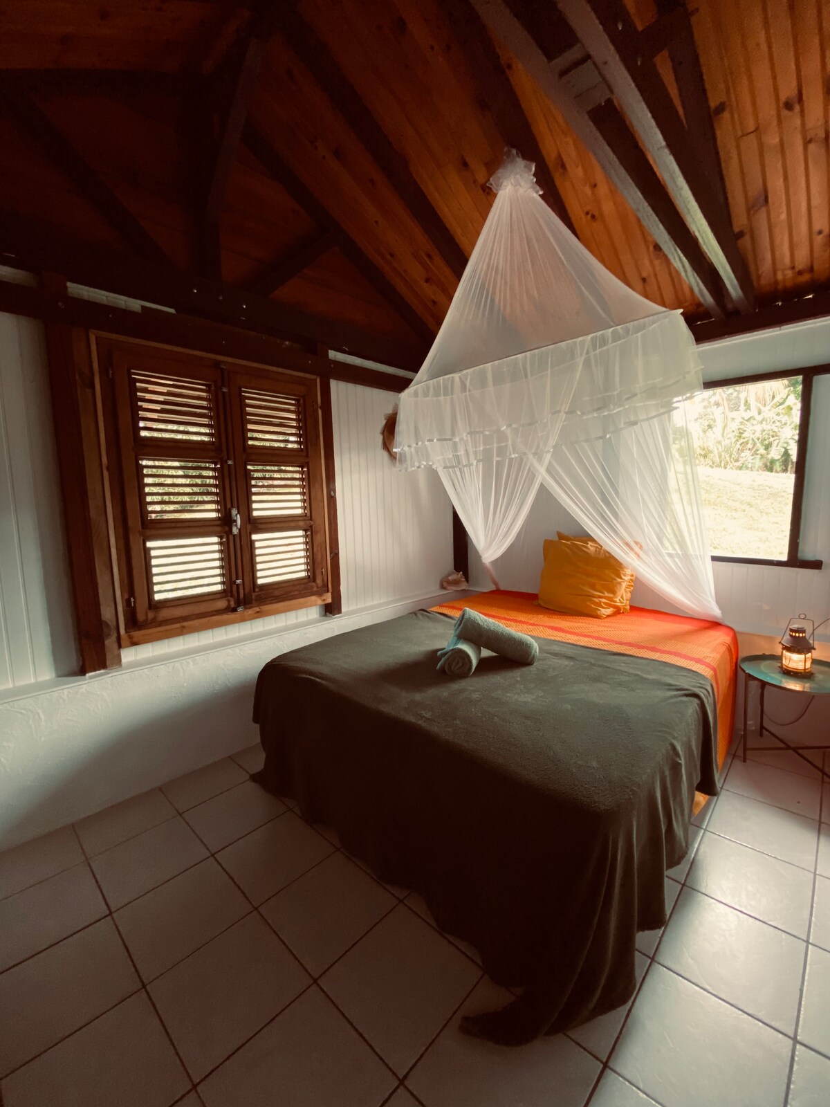 Ovaj mali bungalov se nalazi na 5 minuta od sela Sent Pjer na Martiniku. Direktan pristup šljunčanoj plaži obloženoj kristalno čistim morem i mnoštvom malih riba. Možda imate privilegiju da prisustvujete vrlo rijetkom spektaklu: polaganje kornjača ili izleganje jaja ili gledanje malih kornjača kako se vraćaju u more za nove avanture (poštujući prirodu)... Ili prisustvujete i učestvuju u spokojnom (tradicionalnom ribolovu sa mrežama). Usred prirode!!.