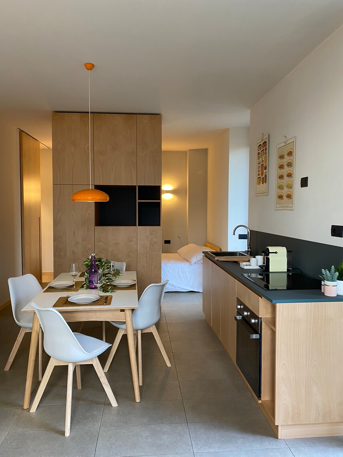 Potpuno novi luksuzni stan u centru Komoa, s pogledom na jezero. Nalazi se pored čuvenog trga Piazza de Gasperi gdje se nalazi Funicolare to Brunate, vila jezera i restorani. Moderno dizajniran kondominijum se nalazi na drugom spratu sa liftom direktno do stana. Velika spavaća soba sa bračnim krevetom, potpuno opremljena kuhinja, dnevni boravak u italijanskom stilu, osunčani balkon i kupatilo sa tušem. Doživite italijanski prestižni stil života Komoa dok se opuštate uz pogled na jezero.