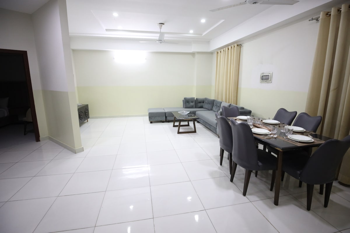 Dobro došli u @blueoakresidences Prostran apartman od 1500 kvadratnih stopa u F-11/1 Islamabadu sa 2 spavaće sobe sa kupatilom, svaka sa privatnim balkonom, toaletom, UPS rezervnim napajanjem, brzim Wi-Fi mrežom, samostalnom prijavom i 58-inčnim pametnim TV-om. Kuhinja, topla voda, besplatan parking, lift koji radi non-stop. Za grupe veće od 4, obezbeđena su 2 dodatna dušeka na podu za najviše 6 gostiju. Kolevka je dostupna na zahtev za 3+ noćenja (5000 PKR). Koraci od Loafology, Nando's, Asian Wok, KFC, Al-Fatah. Park prikladan za porodice je odmah ispred.
