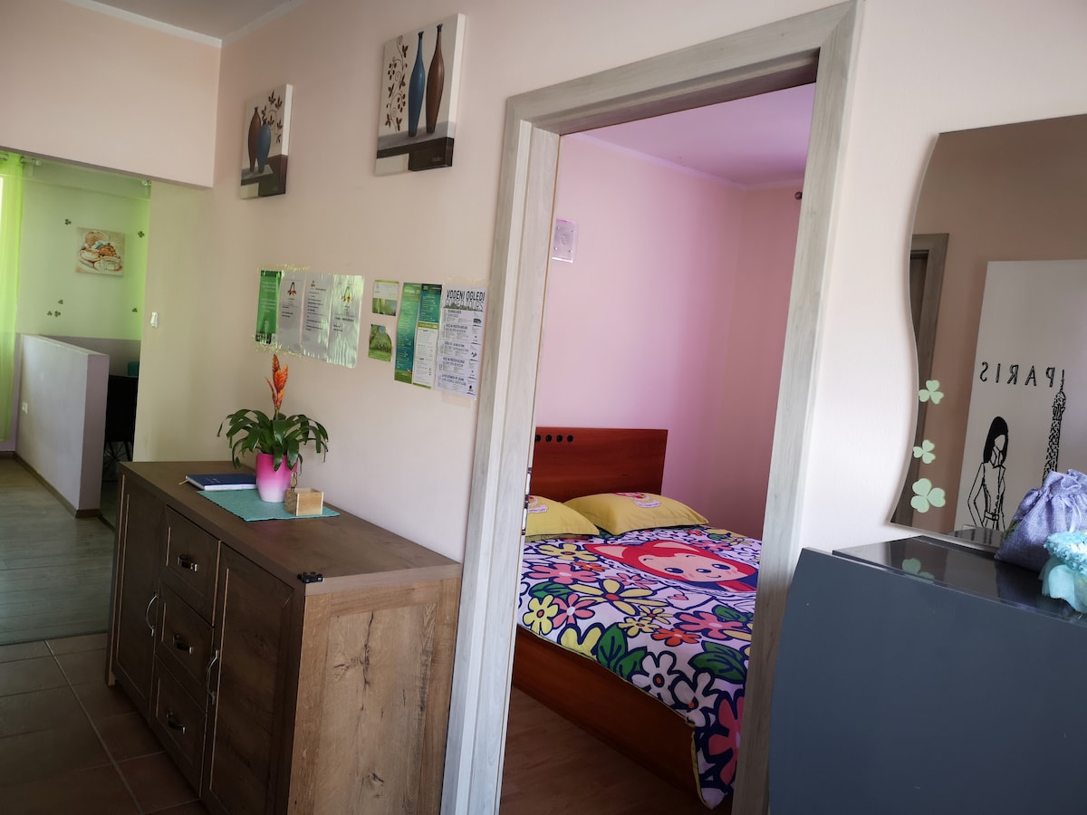 Naš potkrovlje i prostrani apartman ima sopstveni ulaz, veoma je dobra oprema sa sofom za vođe, 1 bračnim krevetom, 1 bračnim krevetom, 1 kaučem na razvlačenje, 32-inčnim LED televizorom, besplatnim WiFi-om, parkingom u kući. Iz stana se pruža veoma lep pogled na planinu KRN, MATAJUR, šumu, baštu...na prirodu.
