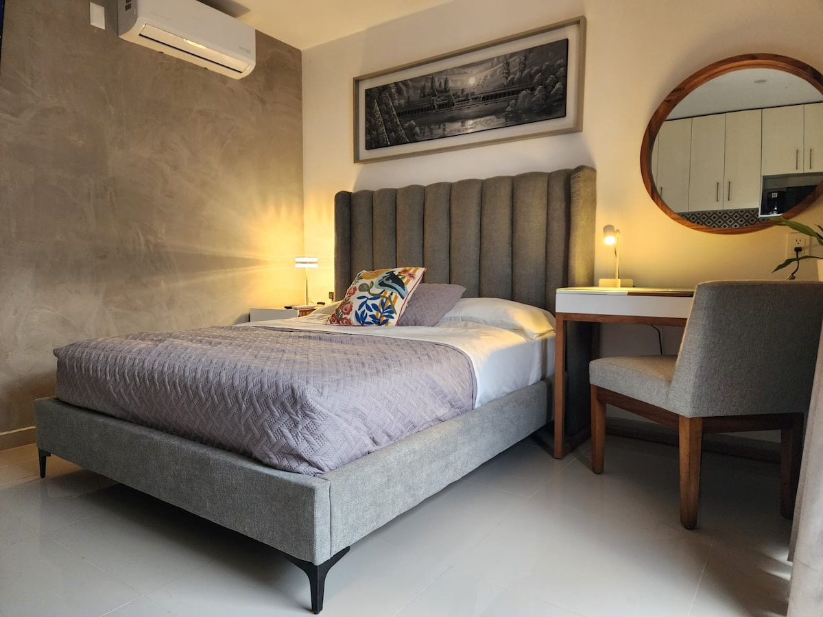 - Acogedor y exclusivo estudio ejecutivo con cama queen-size, escritorio y aire acondicionado. - Balcón para tomar aire fresco. - Cocina equipada. - Ingreso con cerradura inteligente y clave personalizada y exclusiva para cada huésped. - Rooftop panorámico con restaurante en el nivel 9. - Sala de juntas equipada para reuniones profesionales (consultar disponibilidad). - Acceso 24/7 con código personalizado. IMPORTANTE: No contamos con estacionamiento privado dentro de la propiedad.
