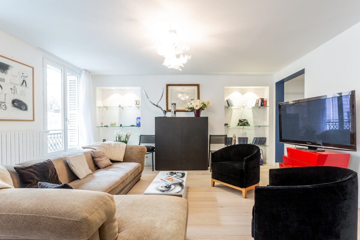 Beautiful 6 rooms apartment with wooden floors, mouldings, fireplaces and a big living-dining room with a Steinway grand piano. Very well situated in a uplifting and very practical to visit district of Paris. Just a few steps from the metro station!