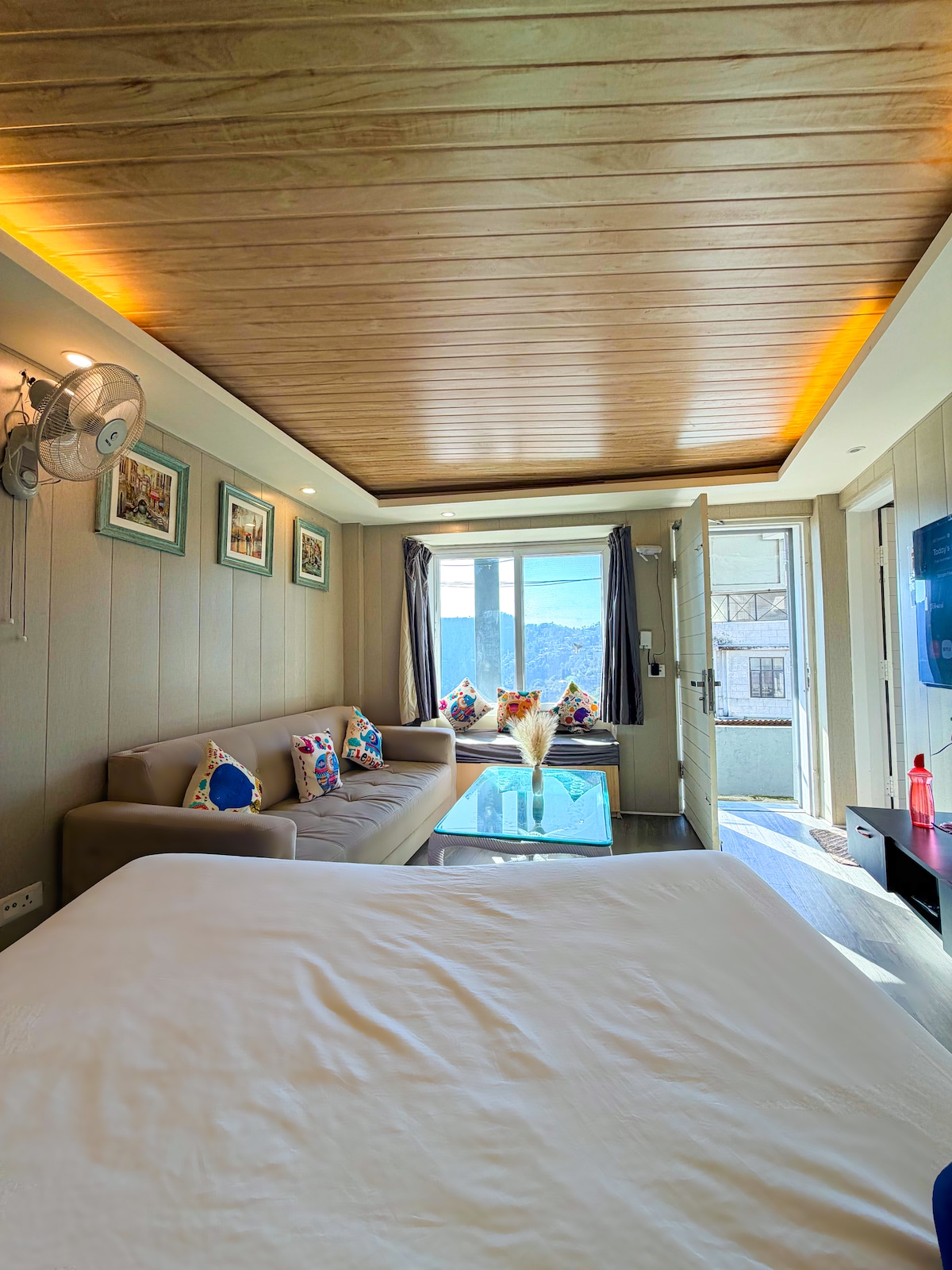 Anand Cottage is a Modern, Cozy & Unique 1.5 Bedroom Home with Beautiful Views of the Hills from the Rooms & 180* Panoramic views of the Mountains from the Common Courtyard. It has the Best Location on the Mall Road, right opposite to everyone’s favourite - Chic Chocolate Along with the Bedroom, The Living Room has a unique Foldable Bed which turns the Room into Half Bedroom and Half Living Room helping accommodate up to 4 people. It is perfect for all - Families, Groups, Couples or even Solo!