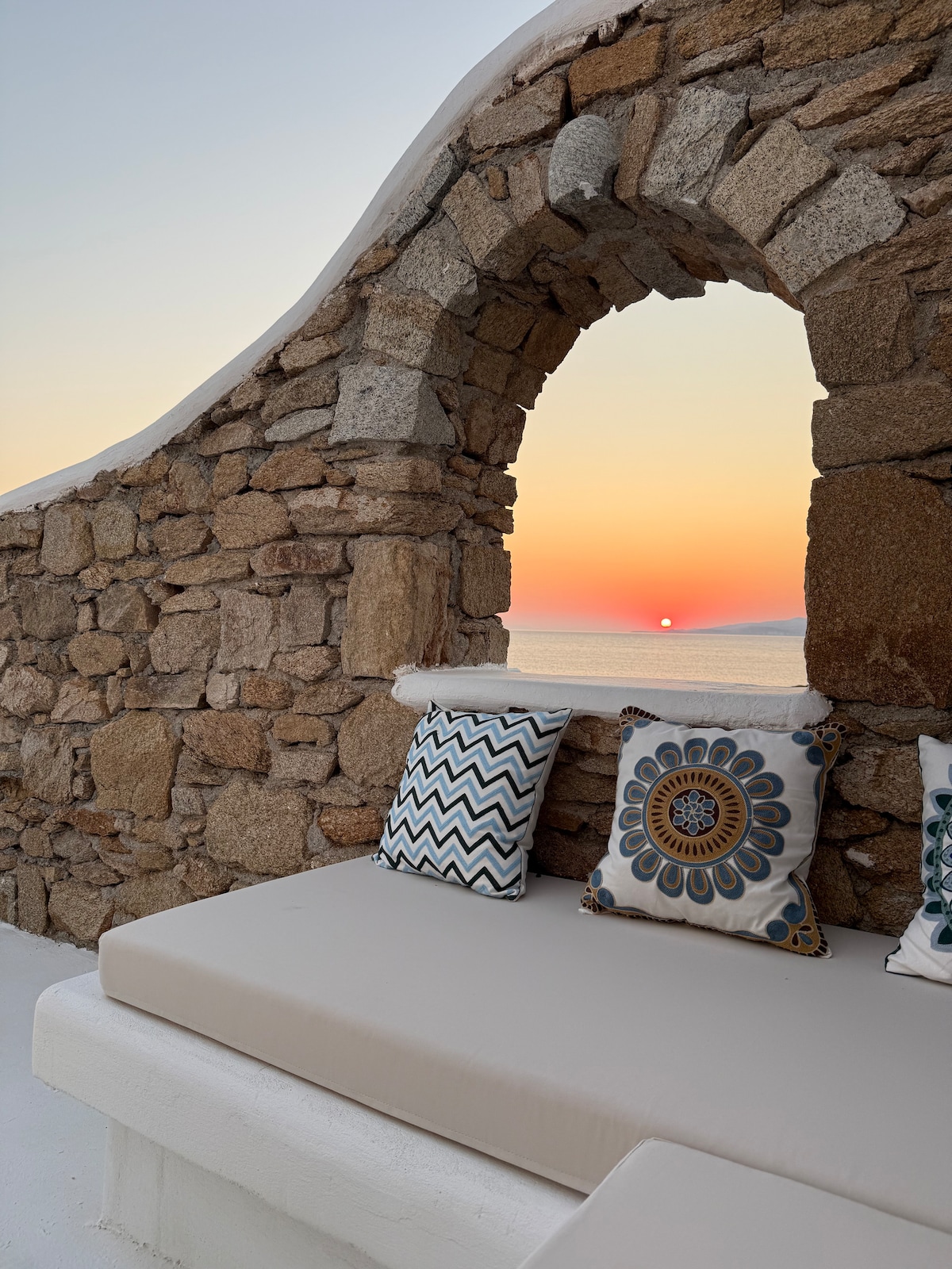 A Mykonos High Sunset Villa Suite Decorated and furnished in earth light tones, tailored to meet the highest expectations. A minimal queen size bedroom with private bathroom and infinity view to the Aegean Sea, a common area with infinity pool. The House showcases its own Mykonian elegance and is perfectly nestled within a stone wall. The apartment enjoys an uninterrupted view of the islands of Delos, offering the picture-perfect Mykonos sunset.