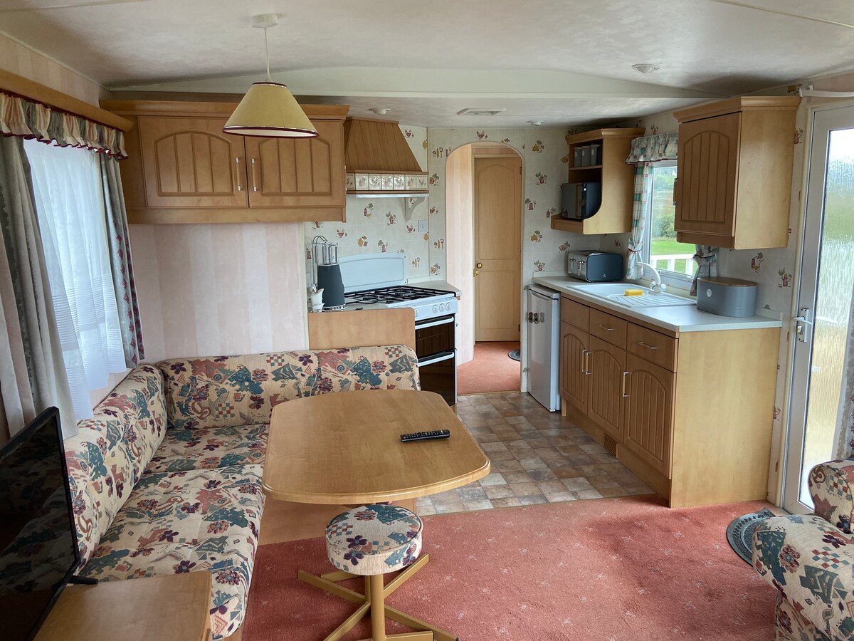 Dvosobna kamp prikolica sa centralnim grijanjem na gas. Glavna spavaća soba ima bračni krevet i dovoljno prostora za odlaganje. Druga spavaća soba se sastoji od 2 kreveta za jednu osobu i ostave. Glavno kupatilo ima potpuno zatvoren tuš. Kuhinja/dnevni boravak je otvoren plan sa velikim zamrzivačem, plinskim šporetom, mikrotalasnom rernom, kuvalom za vodu i tosterom. Dnevni boravak ima 32-inčni pametni TV sa besplatnim pogledom, električnom vatrom i 2 kauča na razvlačenje. Dnevni boravak otvara na terasu kroz dvostruka dvorišna vrata.
