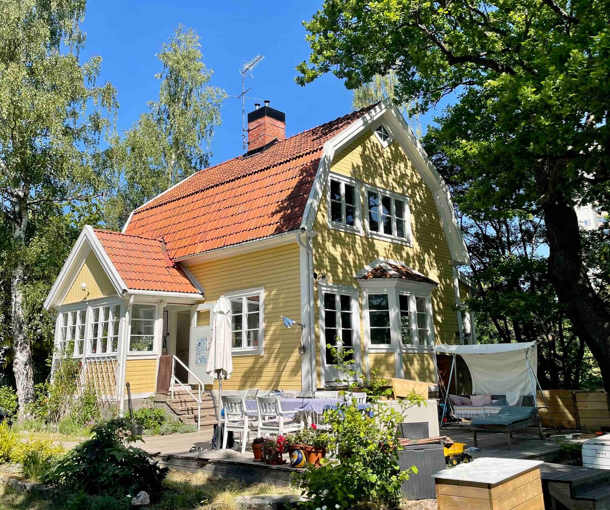 Small apartment -own entrance. The room/apartment has a kitchen with a new stove, oven, microwave, fridge, TV and its own toilet. A spa with a jacuzzi, sauna heated with wood, and relax. Shared recreation room for yoga, with a ping pong table and laundry. The apartment is in our classical villa from 1942 in peaceful area with a big garden and barbeque possibilities. 10 min by car to Södermalm, 15 min to city center with t-bana from Skarpnäck or Skogskyrkogården. For longer stays -shared spa.
