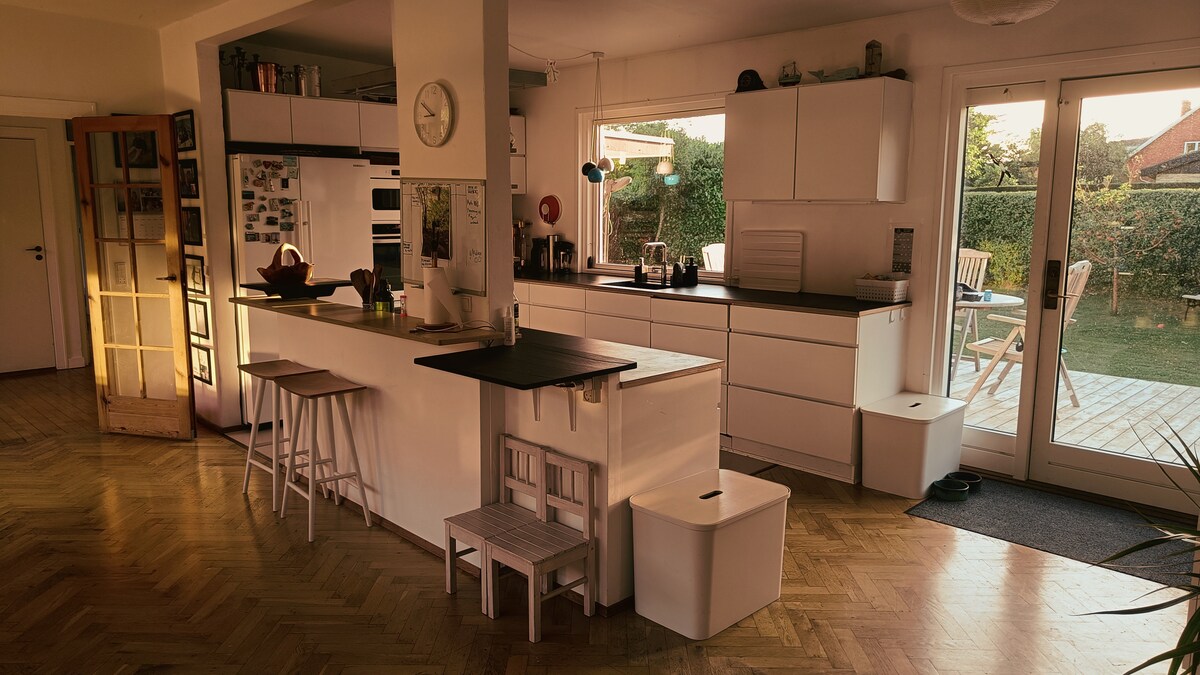 Veličanstvena vila stan od 100 m2 u prizemlju. 3 prelijepe sobe i prozor postavljen za kancelariju. Iz kuhinje možete da izađete direktno na natkrivenu terasu. Veliko kupatilo, sa tušem, mašinom za veš i mašinom za sušenje veša. Ima visoke plafone i mnogo svjetla, a cijeli stan je okružen drvećem i zelenilom. Divna velika bašta. Vrt dvorca Sorgenfri nalazi se odmah preko puta kuće. Mnogo lijepih šetnji. U blizini prodavnice Privatan parking Stanica Sorgenfri - 500 m Lingbi Siti - 3 km
