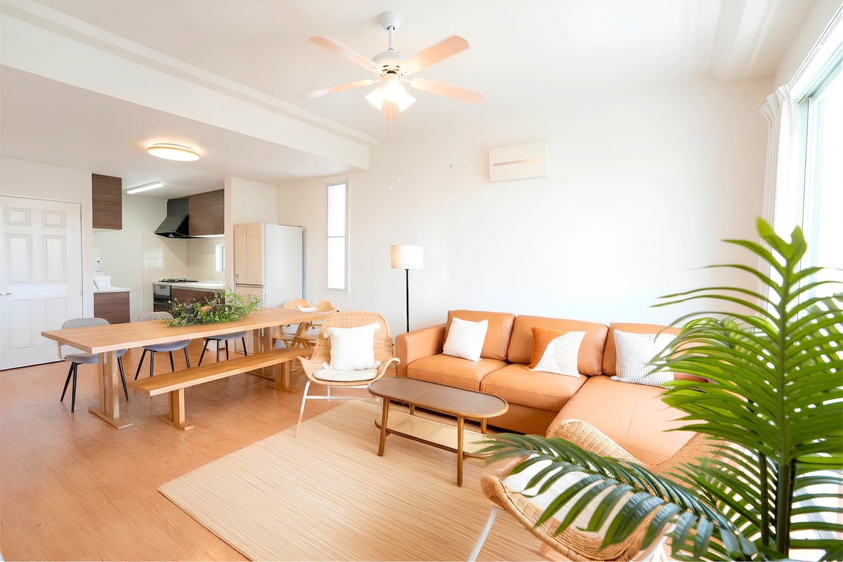 A trusted private house in central Ginowan, a 10-minute walk to Tropical Beach and Ginowan Seaside Park. Ideal for families and quiet small groups, accommodating up to 6 guests. Cafés, local restaurants, and convenience stores are nearby, with PARCO CITY about a 10-minute drive away. The home is professionally cleaned, offers fresh linens, a fully equipped kitchen, washer/dryer, and free parking for two cars. Licensed for short-term stays. Guests appreciate the calm setting and easy check-in.