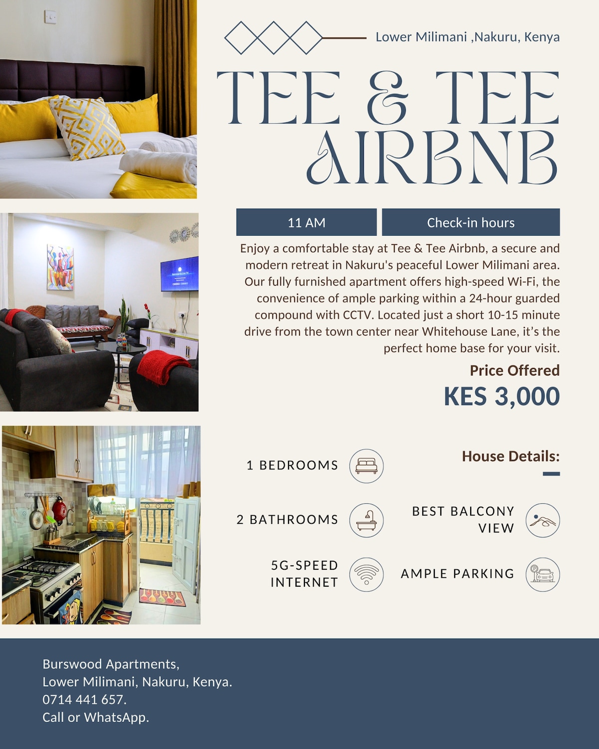 Welcome to this stylish modern villa located in a secure and peaceful neighbourhood, just 7 minutes’ drive to Nakuru CBD. The villa features four spacious en-suite bedrooms, each with its own balcony. An additional upstairs room serves perfectly as a movie room or bedroom. The home is fully equipped for both short and long stays. A power backup system ensures uninterrupted comfort, while a house manager is available to assist when needed. Families with babies - a baby cot bed is available