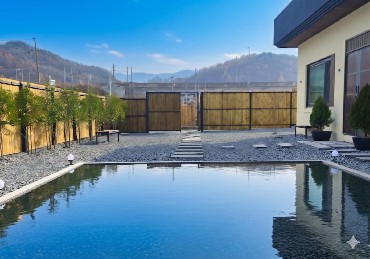 ☆☆ U proleće možete da prošetate sa porodicom u bašti punoj cveća, leti možete da koristite otvoreni dečiji bazen bez dodatnih troškova, a u jesen možete da uživate u hladnom povetarcu koji duva iz doline i šarenom jesenjem lišću, a zimi možete da pečete slatki krompir noću na logorskoj vatri i možete da koristite roštilj bez dodatnih troškova. Kada pada sneg, hodajte stazom sa prijateljem. ☆☆ Ekološka drvena kuća od 23 pjeonga sa svim sadržajima.Tokom vrelih letnjih dana, u dnevnoj sobi i spavaćoj sobi postoje 2 klima-uređaja i ventilatori, a na krevetu je pripremljen i DuraTex rashladni jastučić. Pored toga, pripremili smo kuvalo za pirinač Kuchen i pirinač u frižideru kako ne biste morali da kupujete pola dana. Dođite spremni sa hranom u bilo koje vreme i provedite udobno vreme lečenja. ☆☆ U blizini se nalaze dolina Hwayang, Seolunsan, Gongrimsa i stari put Sanmaki, a tu su i Nonghyup, veliki supermarket, tradicionalna pijaca Cheongcheon, šumski kafić i restoran u kojem možete da uživate u ukusnom obroku u roku od 5 minuta.