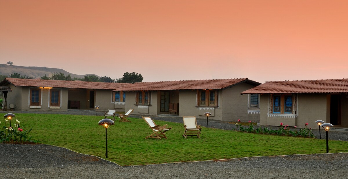 Escape the urban hustle and immerse yourself in tranquility at our vintage-themed villa near Trimbakeshwar. The spacious drawing room boasts a rocking chair in the reading corner, while the verandah with swings offers serene views of mango and guava orchards. Experience the charm of two double bedrooms with double loft beds – a fantasy for every child. Enhance your rural retreat with chulah-cooked meals, completing your immersive experience in the heart of nature.