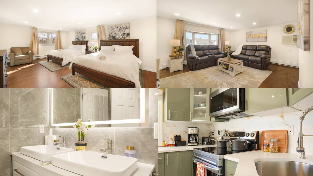 Nalazi se u najpoželjnijoj četvrti Valley Stream, samo nekoliko koraka od Gibson LIRR-a. Uživajte u sistemu za filtriranje vode u cijeloj kući, modernim uređajima, naslonjenom namještaju i izuzetno čistom životu sa ozonom/ultraljubičastim čišćenjem i usisivačima bez prašine. Uključuje Teslu stanicu za punjenje od 45 ampera, parking na prilazu i opcioni prevoz do aerodroma JFK. Popusti su dostupni za goste koji se vraćaju, goste s 5 zvjezdica i dugoročne boravke