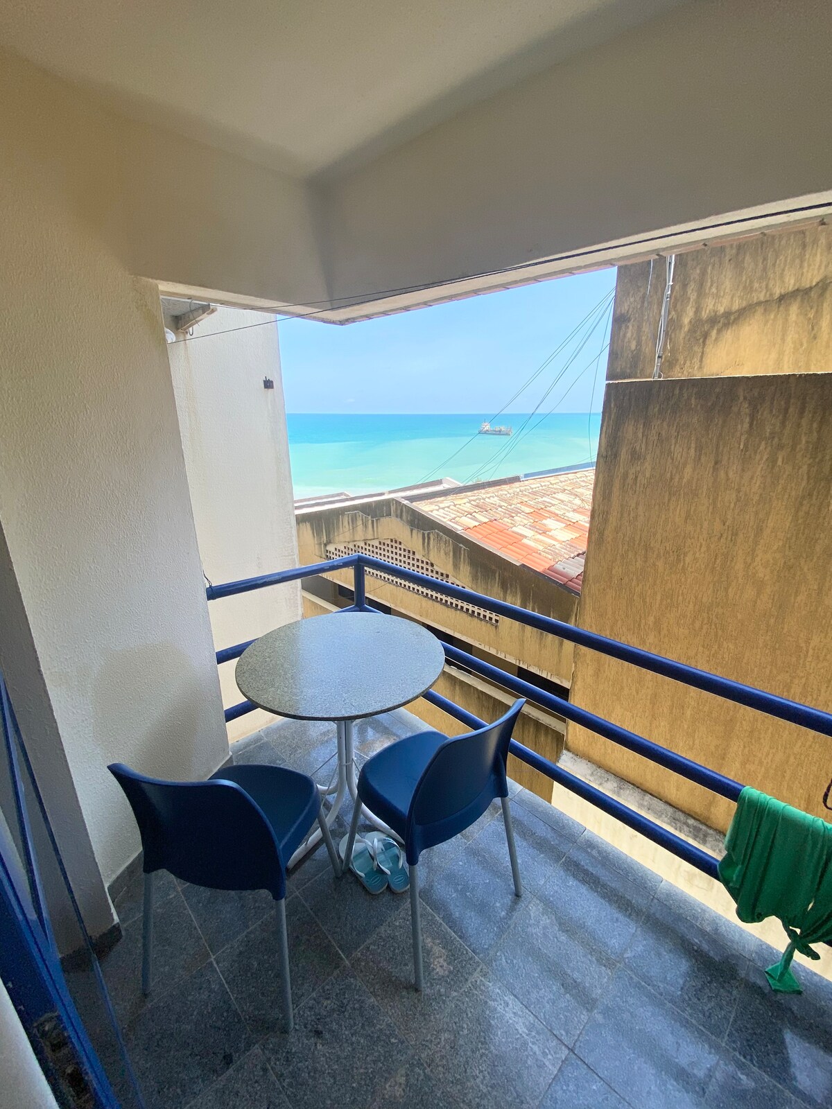 Flat com varanda e vista para o mar.