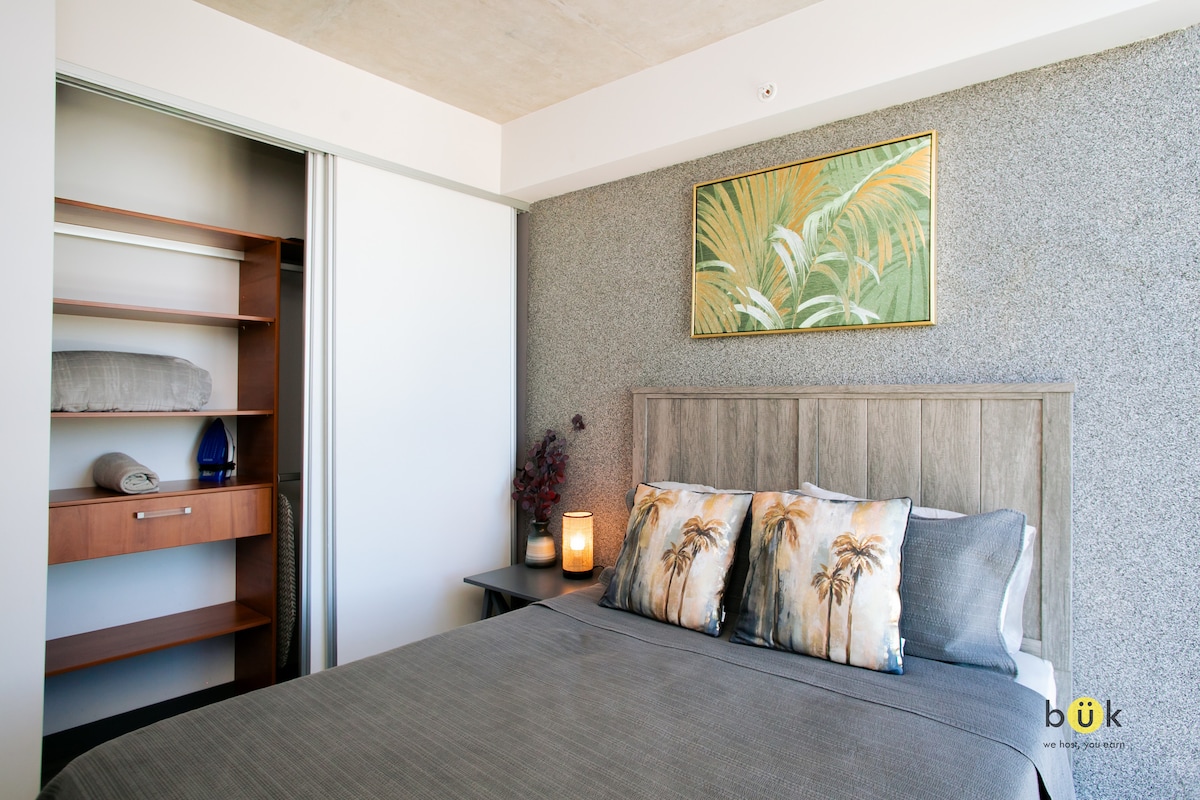 Tropska moderna spavaća soba sa balkonom okrenutim prema centru grada na 21. spratu URBN Escalantea. Uživajte u rekreacionim sadržajima kao što su bazen, teretana na 7. spratu i zajednički rad i salon na 29. spratu sa izvanrednim pogledom na San Hoze. Dodatne funkcije uključuju besplatan bežični pristup internetu u svim zajedničkim prostorijama zgrade, potpuno novi bar na krovu sa pogledom na grad otvoren od 7 do 23 sata