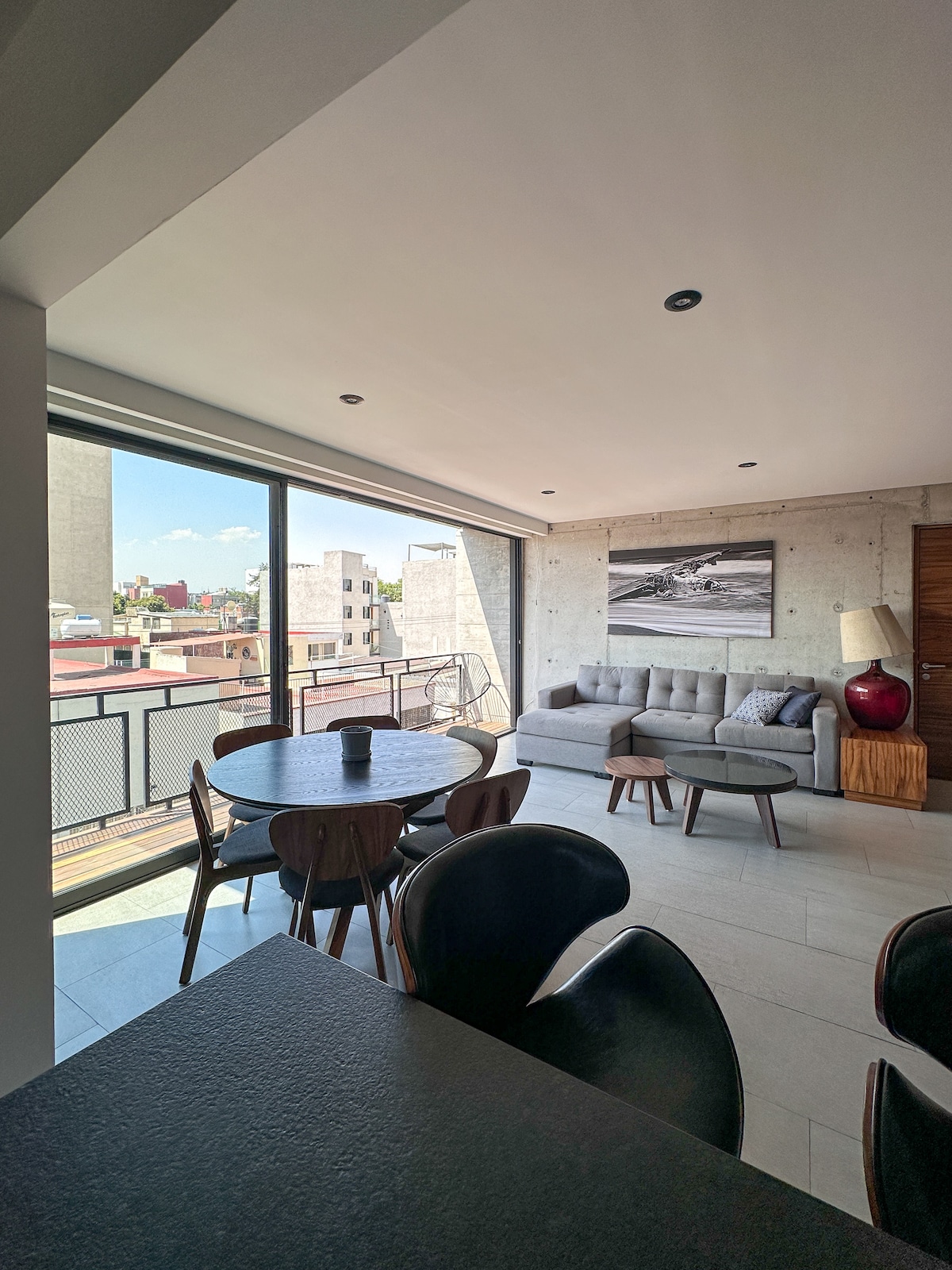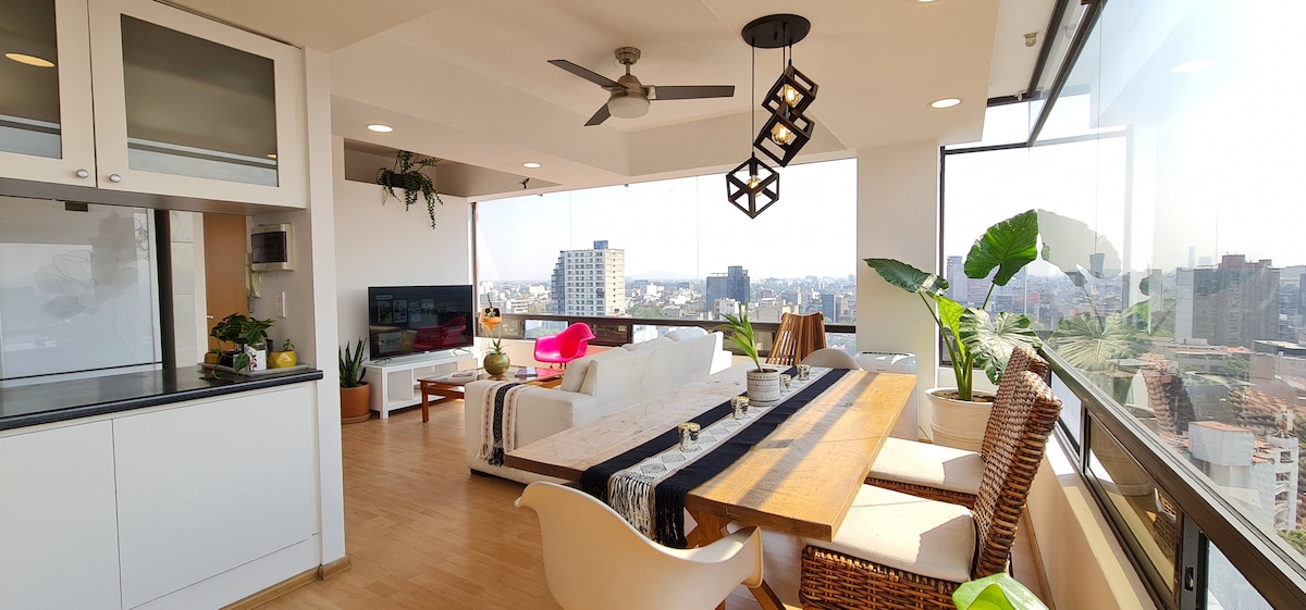 This one of a kind and cozy pent-house is located inside one of the most emblematic developments built in La Condesa neighborhood. Its architecture is a contemporary version of Art Deco. A style that defines La Condesa. It is located in a beautiful, tree-lined area. The atmosphere is very family-oriented, with young and vibrant people. The surroundings invite us to step out, walk, relax and discover new experiences.