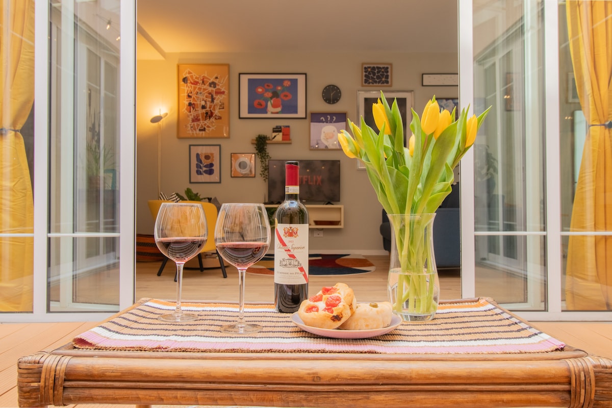 Elegantan stan okrenut ka mirnom dvorištu direktno na kanalu. Živahna i živopisna četvrt: mnoštvo barova, restorana i noćnog života svuda okolo. Ptice će vas ujutru buditi svojim cvrkutom, jedinstveno mesto u živopisnom području kao što je Navigli Milano. Lokacija je savršena: metro stanica Porta Đenova je odmah iza ugla i povezuje vas sa glavnim atrakcijama širom grada, dizajnerski okrug Savona/Tortona je udaljen samo 5 minuta hoda. Vrlo blizu Univerziteta Bokoni.