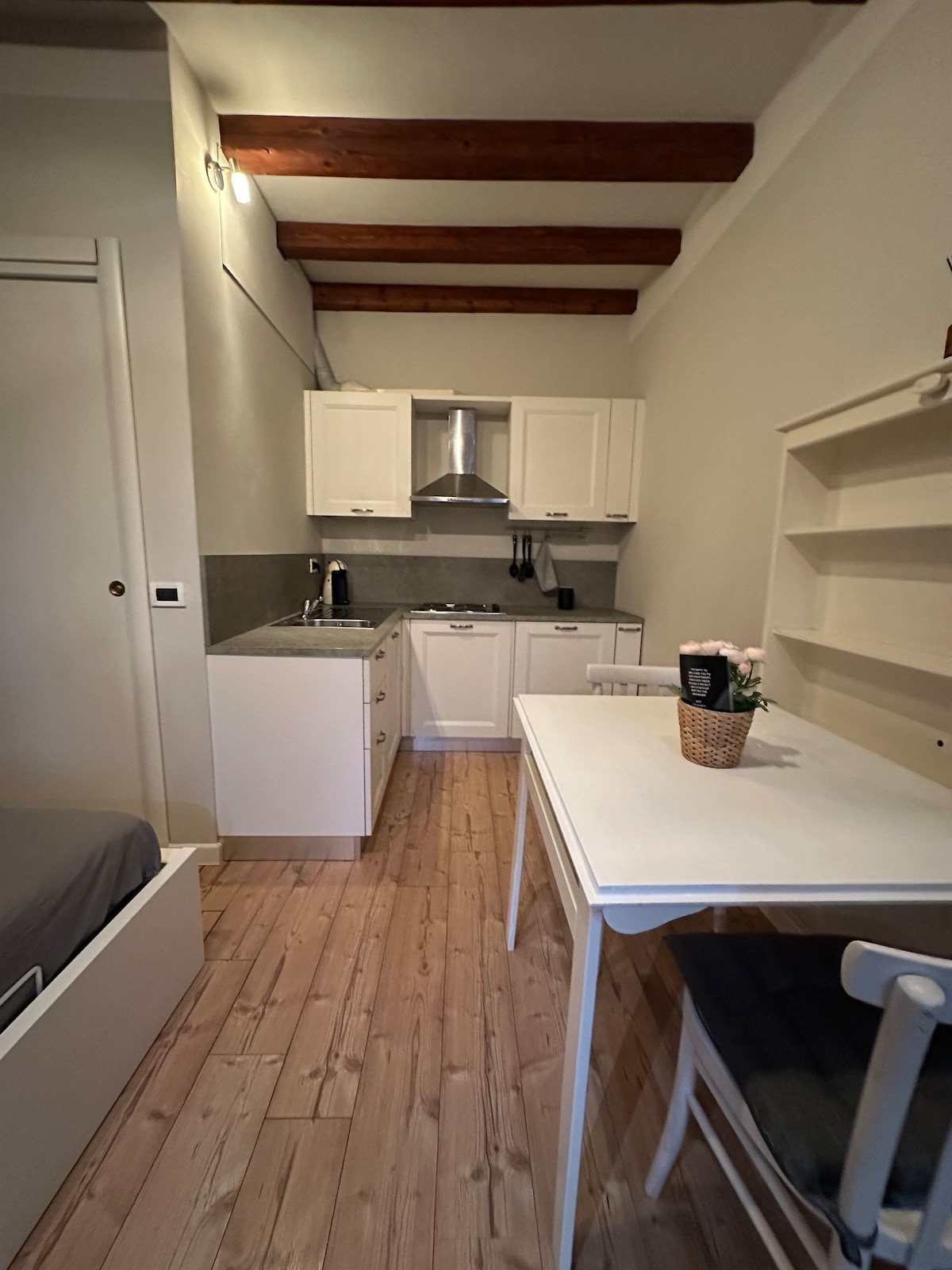Stan se nalazi na međuspratu veoma šarmantne barokne zgrade Langobarskog sagorijevanja, u potpunosti je renoviran . Podovi su napravljeni od mermera bačenog u mozaik ili drveta ukrašenog umetnutim, a tu su i starinski lusteri štukature i originalne drvene obloge kuće koje su u potpunosti renovirane. Veličina je vrlo prostrana i udobna. Stan se sastoji od: velikog dvokrevetnog dnevnog boravka sa TV-om povezanim sa super brzim i prostranim i udobnim svjetlovodnim internetom,povezan lukom sa trpezarijom sa stolom i 8 stolica . Kuhinja sa stolom za 8/10 osoba, ima indukcione požare, rernu ,mašinu za pranje sudova , savršeno je opremljena i funkcionalna. Ima četiri spavaće sobe. Dve su dvokrevetne( jedna sa pogledom na veoma mirno unutrašnje dvorište i jedna na ulici). Dve jednokrevetne sobe (jedna sa pogledom na ulicu i jedna sa pogledom na dvorište) mogu biti opremljene jednim krevetom ili dva kreveta po potrebi . Kupatilo, potpuno novo, opremljeno je prostranom kristalnom tuš-kabinom, drvenim parketom. Stan je takođe povezan, pomoću divnih spiralnih stepenica u ukrašenom kovanom gvožđu, sa velikom kafanom sa potpuno renoviranim kupatilom, velikom staklenom tuš-kabinom, mašinom za pranje veša, užetom za veš, daskom za peglanje.