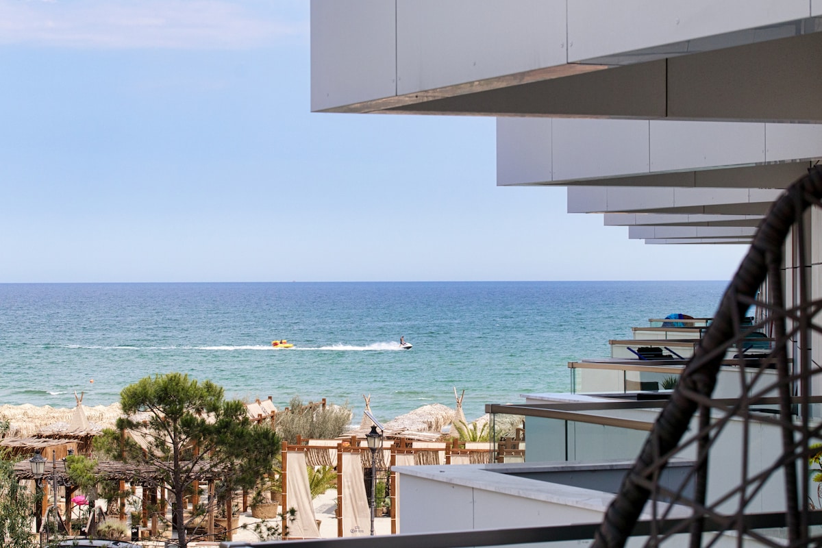 Moderan stan s pogledom na more – Aleci Beach Resort, Mamaia Nord Uživajte u boravku u ovom elegantnom i potpuno opremljenom stanu, koji se nalazi u ekskluzivnom odmaralištu Aleci Beach Resort, samo 1 minut od plaže i popularnih barova na plaži kao što su Nuba, Fratelli i Breeze.