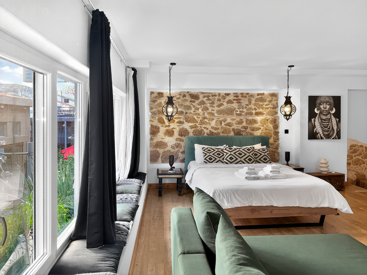 Experience timeless elegance at Afrodite Suite. Our meticulously designed suite offer the perfect blend of modern luxury with accents of ancient charm. Uniquely tailored with warm interior lighting and the glow of a fireplace, our suite creates a soft, whimsical environment. The property is equipped with avant-garde systems and plush bed for ultimate comfort. Enjoy your nights, relax by fireplace, and immerse yourself in local culture and hospitality.