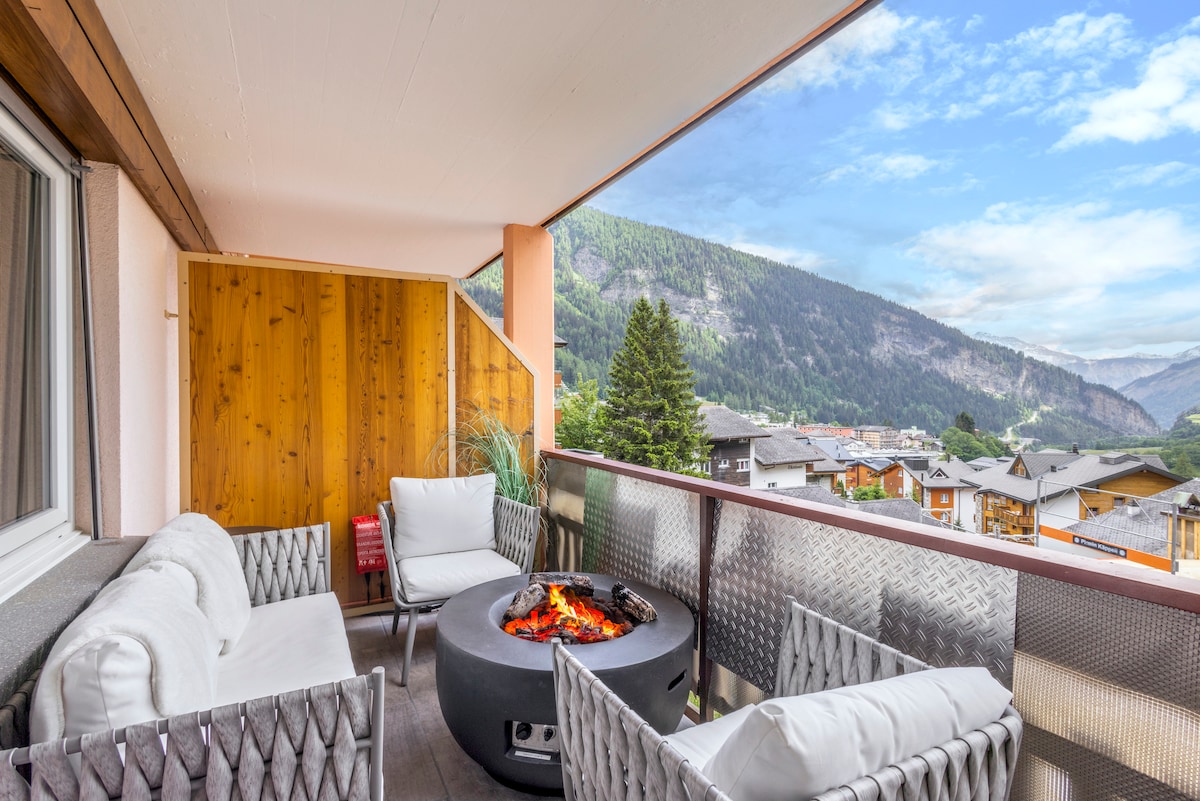 Penthouse studio sa terasom od 100 m2, neprekidnim pogledom na Alpe i PRIVATNOM hidromasažnom kadom. Unutrašnji prostor koji se sastoji od otvorenog dnevnog boravka i trpezarije sa sklopivim krevetom (180 cm), TV-om velikog ekrana, kupatila i udobne kancelarije. Kuhinja ima sve što vam je potrebno. Napolju vas čekaju terasa i pogled. Trpezarijski sto na otvorenom, viseća ležaljka i vatrogasna činija vas pozivaju da se opustite. Blizak pristup žičarima Gemmi & Torrant i termalnim kupatilima.