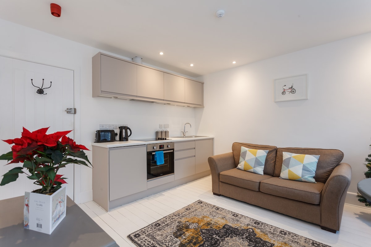 Prostran stan sa karakteristikama perioda. Divan prostor za opuštanje sa 2 kauča, prozorom sa pogledom na more. 55" Sky Glass TV, velika spavaća soba sa mirnim pogledom na zadnju baštu. Dvokrevetni krevet i 1 krevet na rasklapanje sa odgovarajućim dušekom. Kupatilo sa električnom tuš kabinom iznad kade. Svetla kuhinja sa dvostrukim vratima na podignutom dvorištu, savršena za jutarnju kafu i stepenice do velikog privatnog zatvorenog vrta. Obezbeđene dozvole za parkiranje parkinga na ulici pored objekta