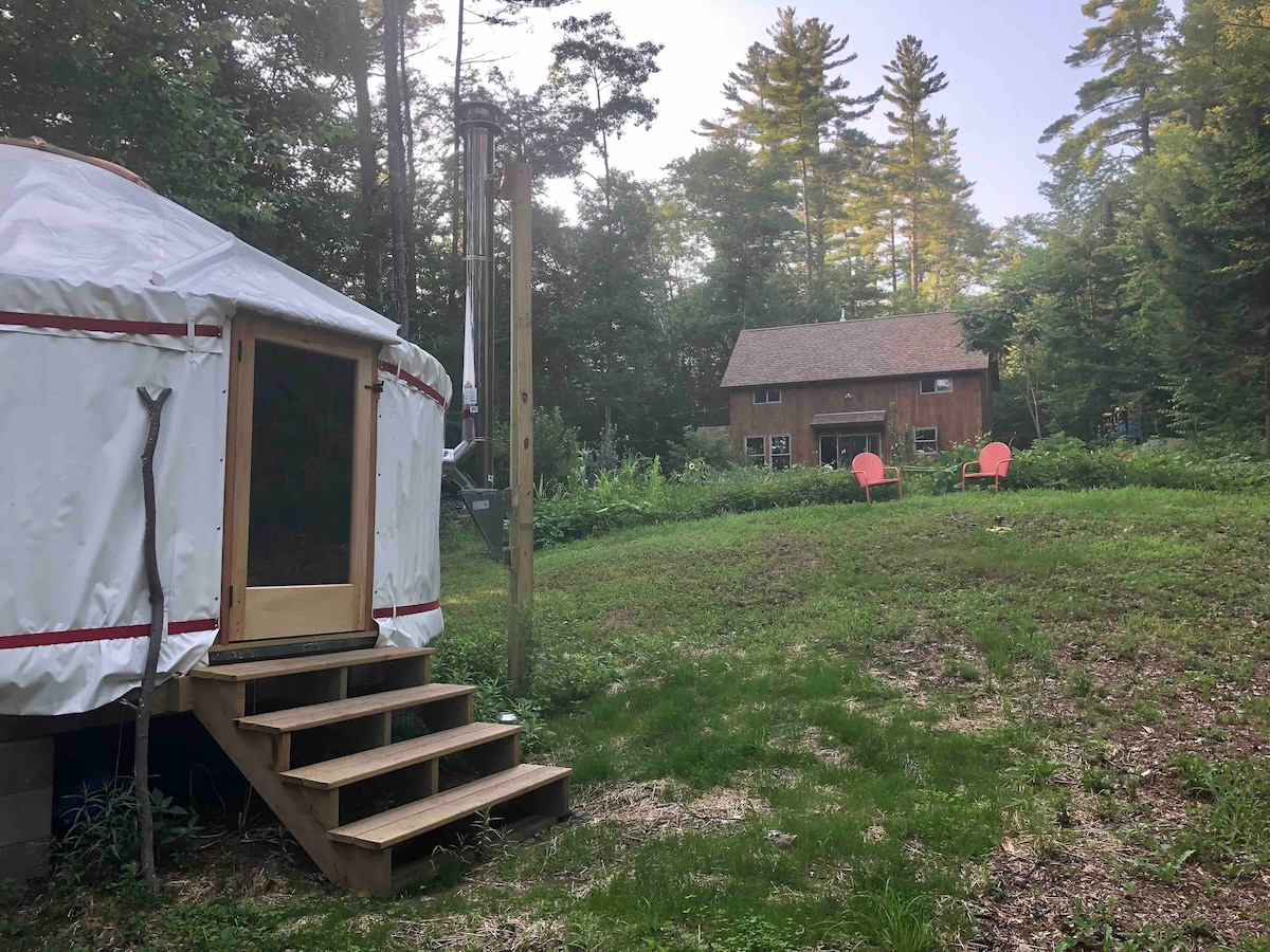 Waterfront oasis. Relax in cozy yurt fully equipped with wifi, cable tv, private bath & outdoor shower tucked in wooded setting overlooking small waterfall in nature's paradise on Powder Mill Pond and Contoocook River. Hike, Swim, Fish, Kayak, Canoe, Paddle boat. Private fire pit. Hot tub. Eclectic dining, 4 golf courses, shops, breweries, skiing all nearby. Just outside of Peterborough in Southern New Hampshire, only 1.5 hrs from Boston or 2.25 hrs. from Hartford in legendary Monadnock Region.