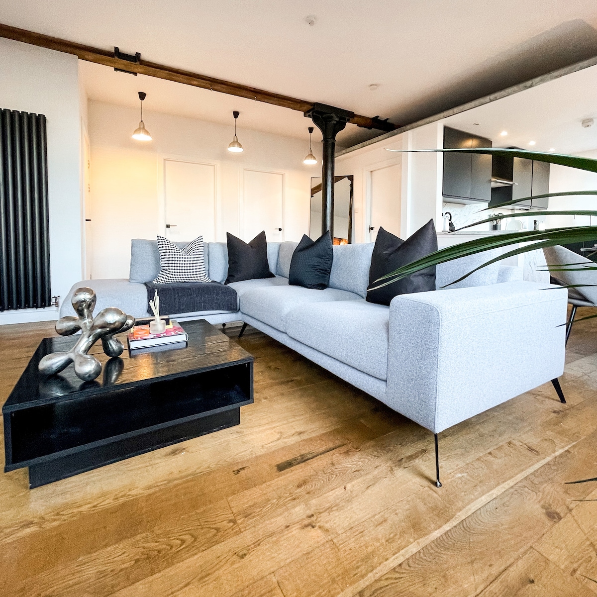 - 65sqm apartments. - Sleeps 3 - Double bed (180x200cm / 71x79in). An additional single bed is available on request. - Fully-equipped kitchen (dishware, cookware, dishwasher, fridge, microwave). - Coffee machine with pods. - Washer/dryer in-unit. - Dining table, sofa, arm chair and smart TV. - Ultra high-speed Wi-Fi. - Modern bathroom with shower, towels, and Bramley toiletries. Every apartment is unique, so your space may differ slightly from photos.