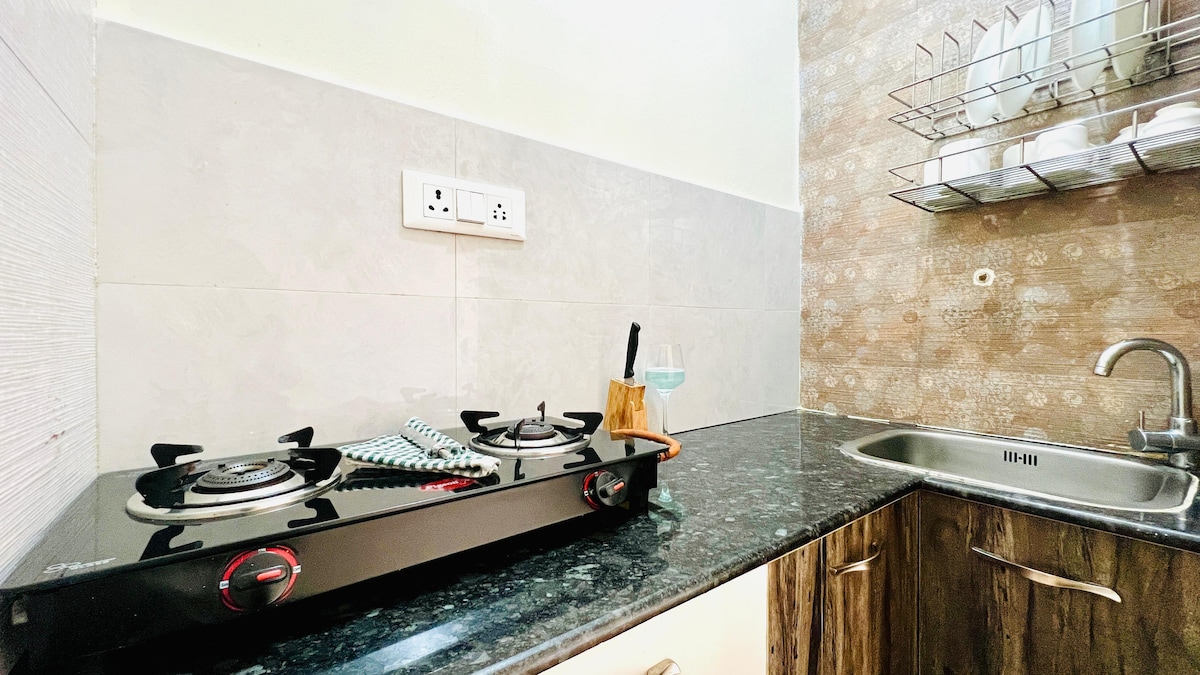 Uživajte u luksuzu u ovom elegantnom studio apartmanu koji se nalazi u blizini aerodroma i tržnog centra CC2. Savršeno za parove, porodice i prijatelje koji traže poseban odmor. Sa brzim internetom od preko 100 Mbps, ovaj stan je takođe idealan za one koji rade od kuće. Uživajte u pristupu bazenu i teretani u sklopu objekta, a ostanite povezani jer se objekat nalazi u blizini glavnih atrakcija: 6 km od Međunarodnog aerodroma Kolkata, 1 km od centra grada II i 2 km od Eko parka.