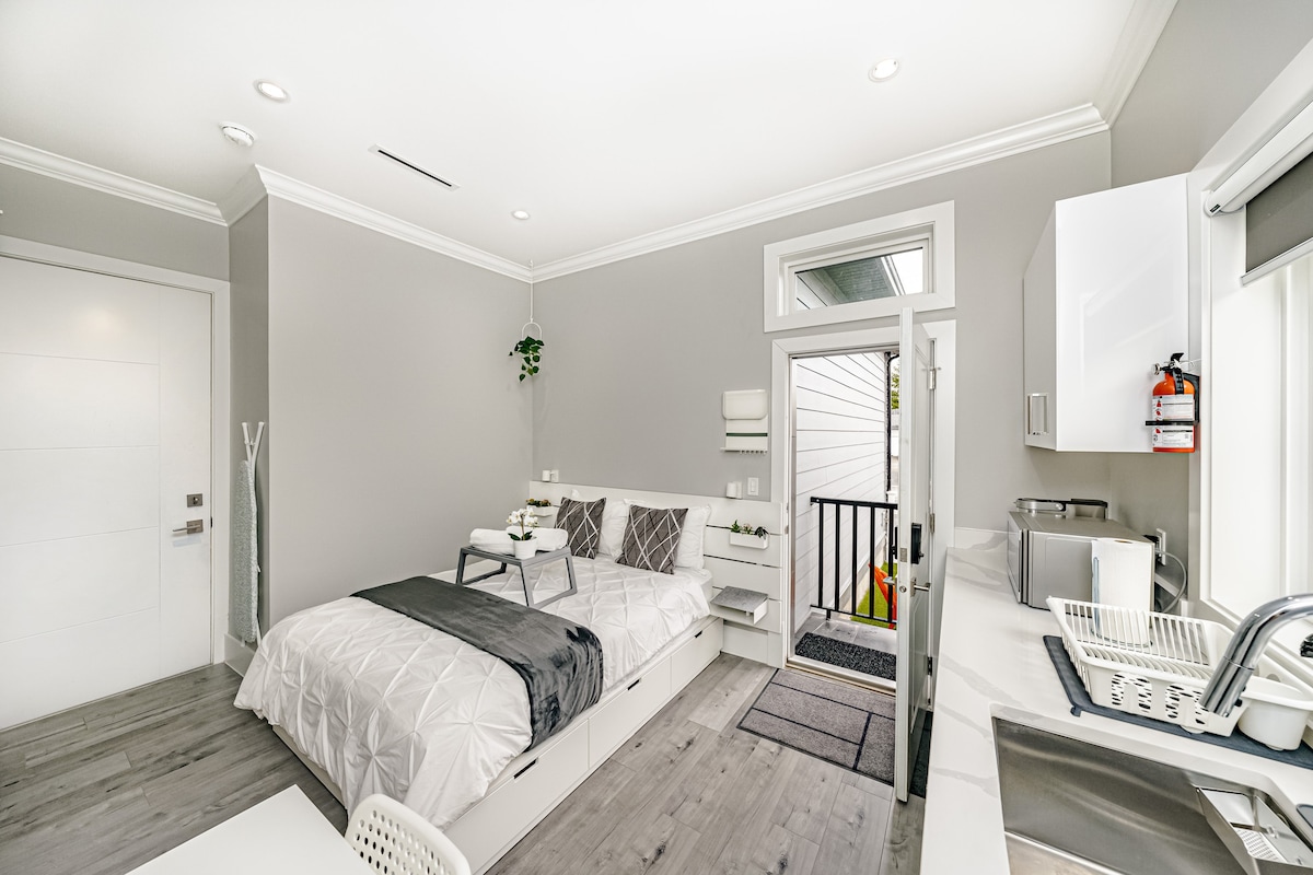Vaš savršeni dom daleko od doma! Ovaj udoban apartman ima klima-uređaj, udoban veliki bračni krevet, namenski radni prostor, mašinu za pranje/sušenje veša u jedinici i besplatan parking. Smešteni u istorijskom i živopisnom Kvins Parku, jednom od 10 najboljih kvartova u Donjem Mejnlandu, uživaćete u ulicama okruženim drvećem, nasleđu i gostoljubivoj zajednici. Uprkos mirnom okruženju, nevjerovatno je praktično: samo 1 minut do autobuske stanice 105 i 10 minuta do Kolumbija SkyTrain, što olakšava prevoz.
