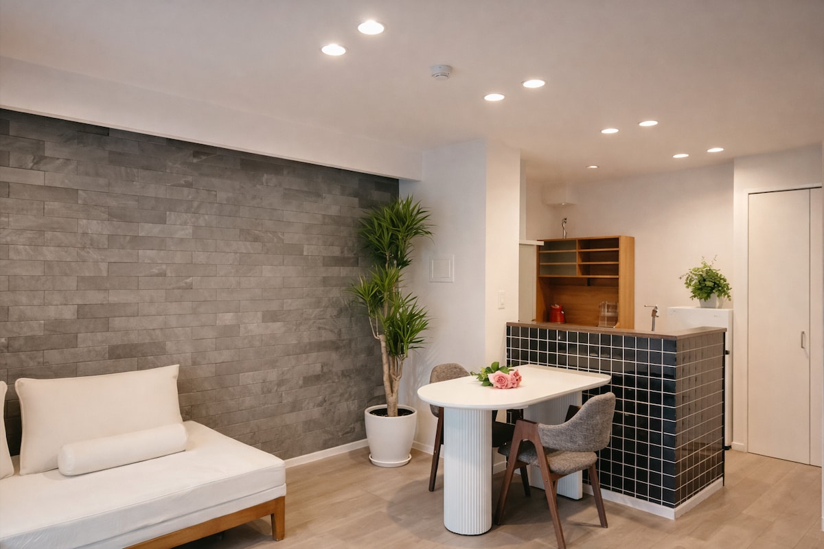 This designer room is a 2LDK measuring 43.5㎡. It's a 5-minute walk to Nankai & Osaka Metro Tenkachaya Station. From there, it's just two stations (5 min) to Namba Station on the Nankai line and a direct 35-minute ride to Kansai Airport. The Osaka Metro Sakaisuji Line directly connects you to key tourist destinations like Kyoto. ◆Features Easy access to Namba, Kansai Airport, Kuromon Market Stress-free self-check-in system Available in Japanese, English, and Chinese High-speed Wi-Fi available