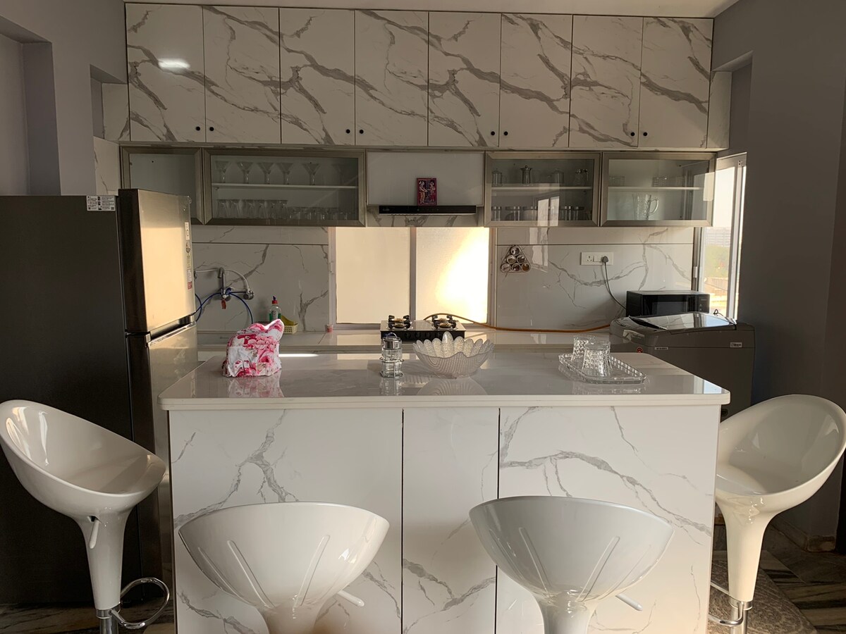 Forget your worries in this spacious and serene space. About Apartment : 4 Storey building with 8 families House details : 1 living room 1 dining room 3 bedroom 2.5 washroom 1 balcony 1 wash area 1 private terrace fully furnished including 2 double beds, 1 bunk bed, cupboards, storage, dining table with 6 chairs, 4 Air conditioners. Common amenities : Lift, Covered Parking, Common garden. Near by : within 0.5 km - bank, jain temples, shopping area, mall, subhanpura garden.