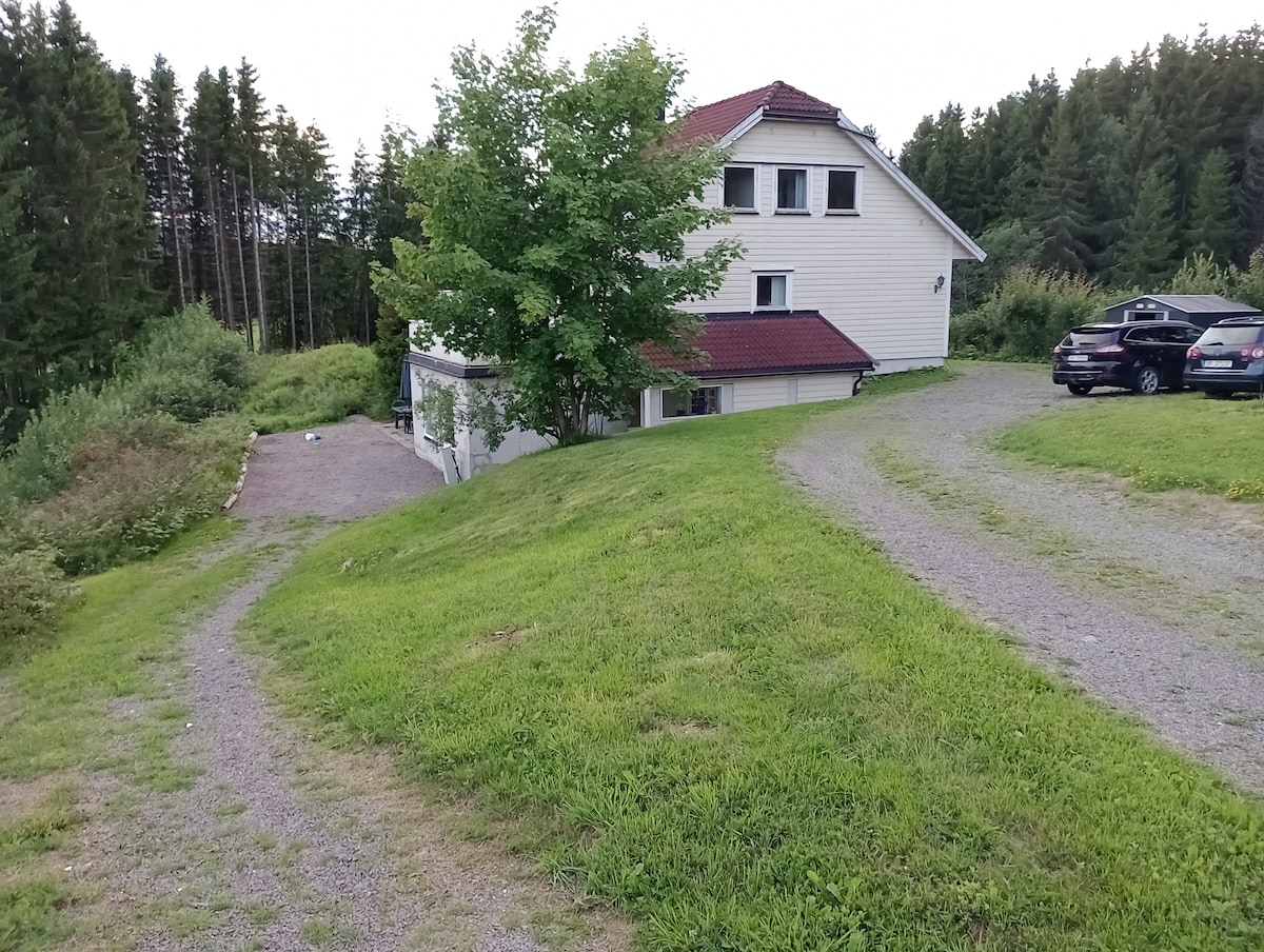 Jedinstvena kuća u šumi koju je projektovao arhitekta – 15 minuta od grada. Kuća je savršena za porodicu ili grupu od 6–8 osoba i ima sve sadržaje koji vam mogu zatrebati za udoban boravak. Lokacija je savršena za opuštanje i uživanje u prirodi, bilo sa imanja ili korišćenjem pešačkih staza u okolini, leti i zimi. Zimi su na raspolaganju uređene staze za skijaško trčanje na 400 metara od kuće. Autobus 56 do čvorišta (metro, tramvaj) Storo saobraća na svakih pola sata, na samo 2 minuta od kuće.