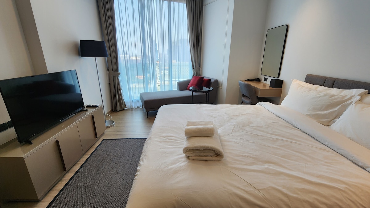 60 sq. m. room with 2 bedrooms, 2 bathrooms, and 1 kitchen - King-sized bed comfortable for 2 people (with a private bathroom) - Queen-sized bed comfortable for 2 people - A regular sofa for 1 more person - A private bathtub in the balcony section - Towel and bathroom items provided - refrigerator, stove, microwave, electronic kettle - pots and pans, dishes, cutlery, cups, wine glasses - smart TV (access to apps like Netflix & Youtube Premium) - High speed internet (500/500 Mbps)