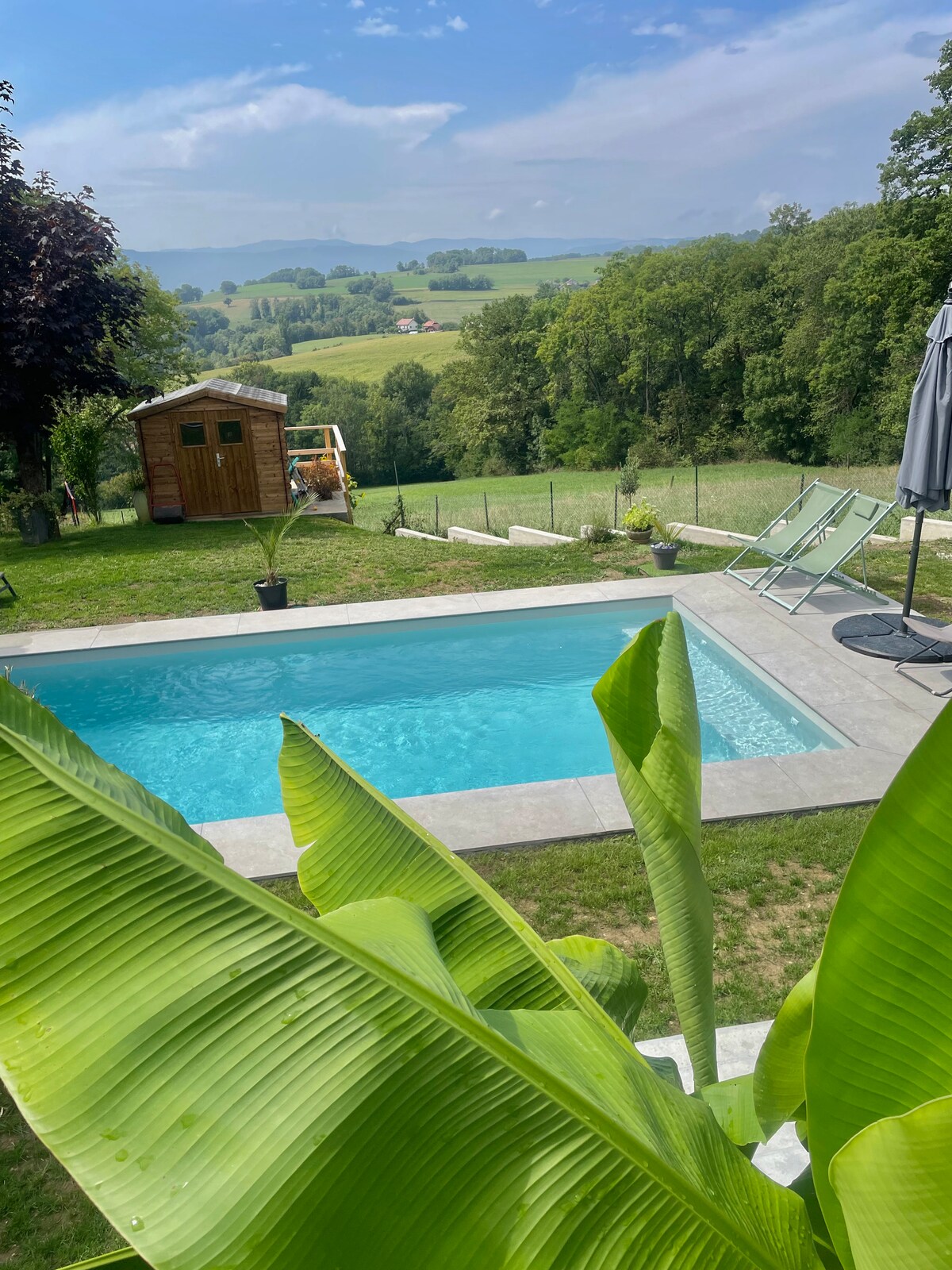 Stan od 42 m2 sa terasom u prizemlju naše kuće sa panoramskim pogledom na Ansi i planine Bazen sa slanom vodom 12m x 5m otvoren od Od 1. maja do 15. oktobra (deli se sa drugim smeštajem na Airbnb-u i domaćinima). Peškiri za bazen na zahtev Kupatilo u tuš-kabini, umivaonik,WC šolja Potpuno opremljena kuhinja Posteljina 160 x 200 cm Televizija, WiFi Privatan parking Mirna četvrt 5 minuta hoda do pekare, apoteke i prodavnice Autobuska linija br. 1 do Anesija za 15 minuta