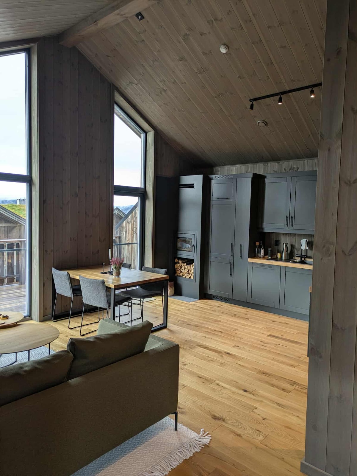 Newly built mountain lodge (2022) in massive wood. The apartment is inviting and cosy, with interior in Scandinavian style. You will find all the comfort and equipment you need to relax & enjoy delicious food and company after an active day! Have your morning coffee outside in the sun, overlooking the mountain tops. Light a fire, enjoy the views from the sofa & makes use of our books or boardgames. Maybe you prefer watching a movie on The Frame? Have a good night sleep in the fresh air!