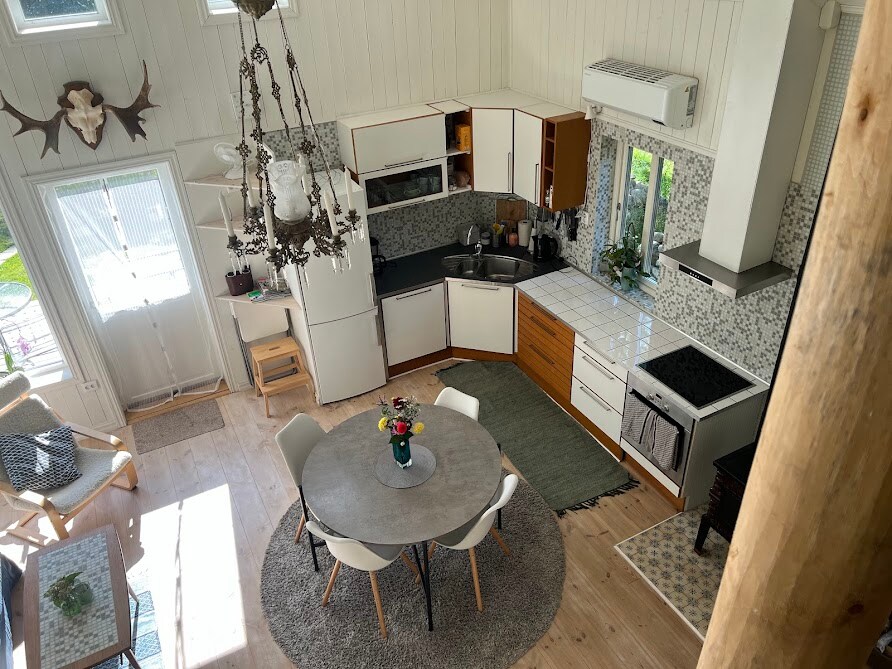 Brvnara 127 m2 sa šarmom starog svijeta, ali modernom opremom. Kamin, moderna kuhinja moguća oprema, kupatilo sa WC tuš kabinom, sauna i mašina za pranje veša, kupatilo sa WC-om i tuš-kabinom. Tri dvokrevetne sobe. Plahte i peškiri se donose ili obezbeđuju 130 sek ili 13 €/komplet. Rezervišite pre dolaska i platite gotovinom. Čišćenje NIJE uključeno. Želimo da vas očistimo kako bismo rezervisali ranije prije vašeg dolaska. Naknada za čišćenje 1000 kr/100 E. Balkon sa pogledom na jezero. Brod je besplatan. Iznajmljivanje motora SEK 1000/100 E.