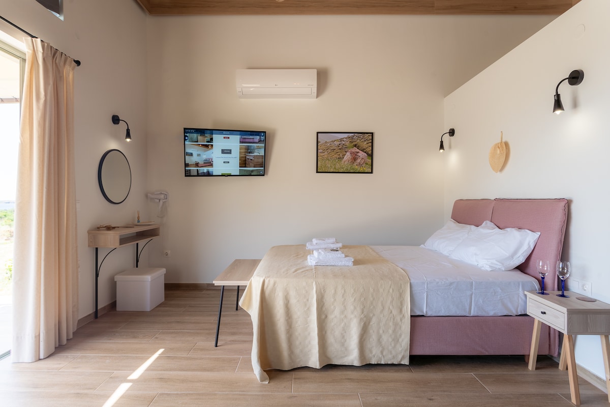 Ovo je soba u prizemlju sa dvorištem . Pogodno dizajnirano da vam pruži udobnost za poseban boravak sa tradicionalnim karakteristikama. Doživite uronjenost u to da budete dio lokalne zajednice i želite da komunicirate s nama ! U renoviranoj sobi će se odmoriti sva vaša čula. Besprekorna čistoća pokrivača nam je prioritet. U našem smještaju ćete pronaći knjige i informacije o ostrvu i našem selu!