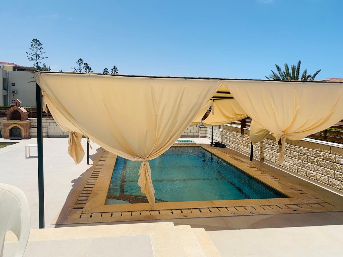peaceful way to achieve your summer goals in egypt, with the Mediterranean sea view in the balcony , combined with the 250m square greneries on each side of the house additionally, it has the barbecue corner with a calm patio sea view, every room has its bathroom, also huge pool nearby the chalet, enjoy your stay on the Mediterranean sea view.