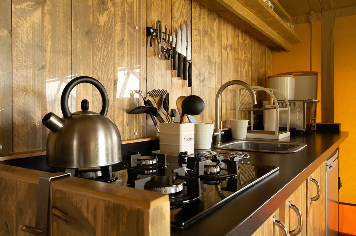 Šator „Poppy“ ima pravi bračni krevet Mini frižider Električna svjetla i vilinska svjetla u njemu. Futon za jednu osobu Električne stanice za punjenje Tepisi Svjetla za čaj Šećer od kafe sa čajem Šporet na plin sa dvostrukim plamenikom, šerpe i tiganji i kuvalo za vodu Lepi tuš u kadi sa pokretnim krovom, umivaonik i toalet za kompostiranje (čisti se po potrebi) Spoljašnja rerna za picu Klupa za piknik Roštilj Ognjište Obezbijeđene šibice na drveni ugalj 🌼🌼Hidromasažna kada se naplaćuje 30 £ po boravku i🌼🌼 plaća se putem air bnb dodatnih usluga
