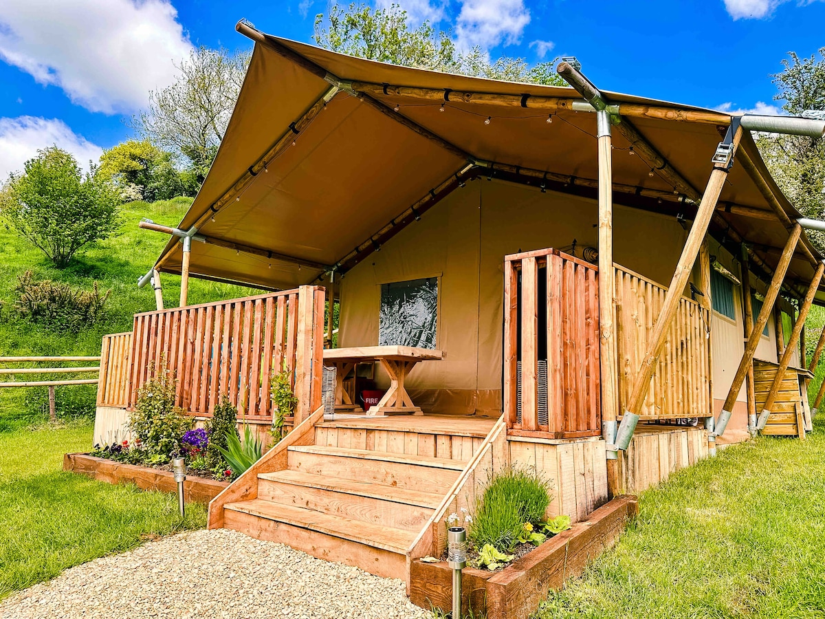 Safari šator Swallows u Dorsetu, sa štalama i barom u sklopu objekta