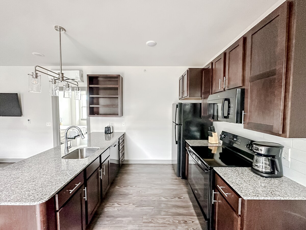 Zaboravite na brige u ovom prostranom i mirnom prostoru. Naš luksuzni apartman ima 828 kvadratnih stopa i ima uređaje od nerđajućeg čelika, mašinu za pranje i sušenje veša u punoj veličini i novi namještaj. Ovaj novoizgrađeni apartman (2024) sadrži svu osnovnu opremu za kupatilo i kuhinju. Naša spavaća soba uključuje veoma udoban bračni krevet sa noćnim ormarićima pored stočića sa USB priključcima na lampama.