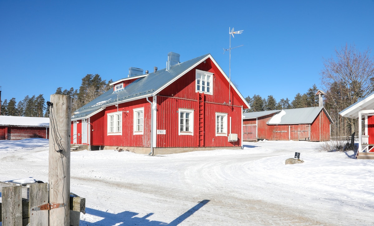 Stan u kući na farmi u prelepom i mirnom području. Na farmi se nalaze 2 minijaturna konja. Plaža je udaljena oko 300 metara. Brod je dostupan. Kiuruvesi oko 10 km. Možete da kuvate u zatvorenom prostoru u kuhinji ili napolju u skloništu za roštilj. Kuhinja ima mašinu za sudove, električnu rernu, mikrotalasnu rernu, aparat za kafu i kompletan komplet posuđa. Na spratu su 2 spavaće sobe i kuhinja u prizemlju koja može da primi pomoćni krevet ako je potrebno. Zajedničko kupatilo.