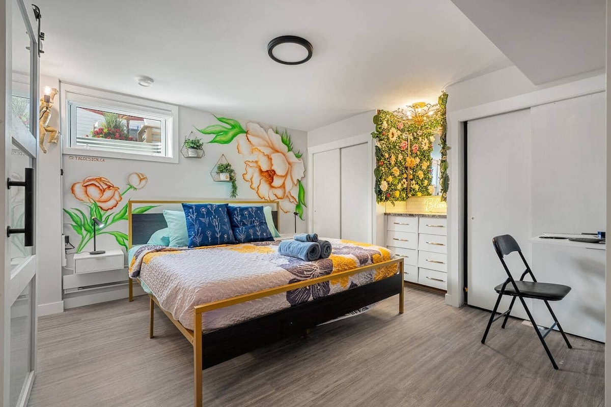 Step into this vibrant basement suite, where art, comfort, and entertainment create an unforgettable stay. Just a 5-minute walk to nearby Mall with groceries, restaurants, and more. Ideal for families, fully stocked for long stays, and only 15 min 🚗 to downtown. ✔ Themed rooms w/murals 🎨 ✔ Fully stocked coffee bar ☕ ✔ Fireplaces 🔥 ✔ Rooms w/KING beds & Smart TVs 🛏️ ✔ Board games 🎲 ✔ Musical instruments 🎶 ✔ Prime location for city access 🌆 Book now to make your Edmonton stay memorable!