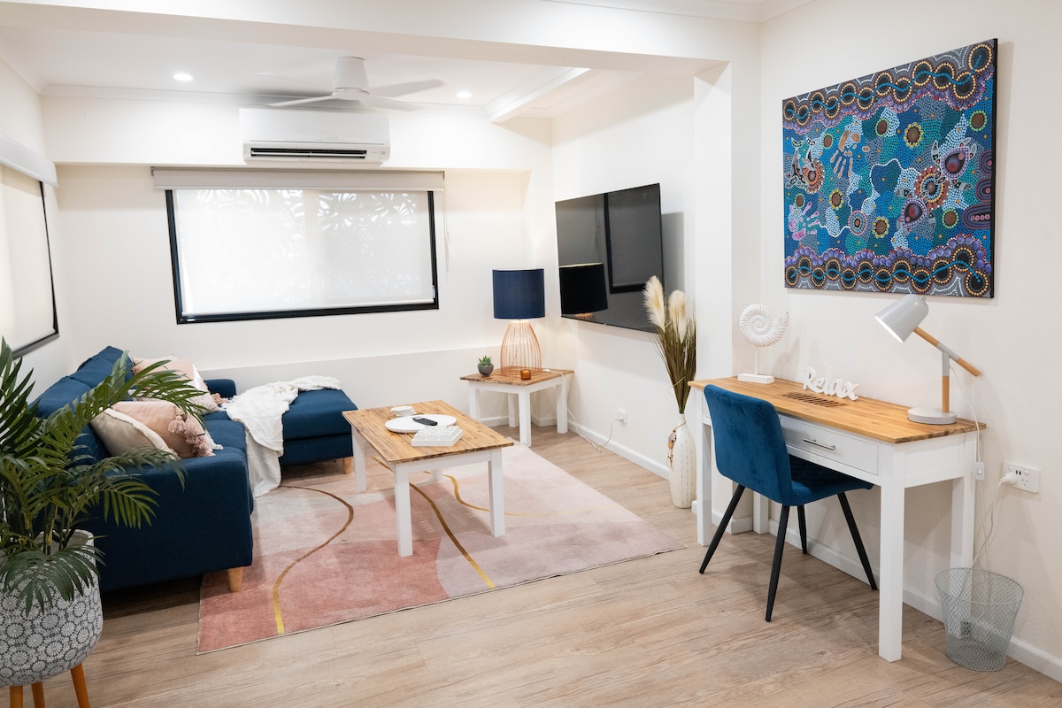Naš moderni, tropski, potpuno samostojeći, jednosobni stan za bake je savršeno mesto za istraživanje Darvina i njegovog okruženja. Smješten ispod naše porodične kuće, ovaj miran stan za bake je savršen za jednu osobu ili par – sa bračnim krevetom, dovoljno prostora za krevetac i uključuje kuhinju i kupatilo. Tu su svi uređaji, posuđe i posuđe koje ćete morati da pripremite oluju. Takođe postoji pristup zajedničkom vešu i predivnom bazenu sa slanom vodom.