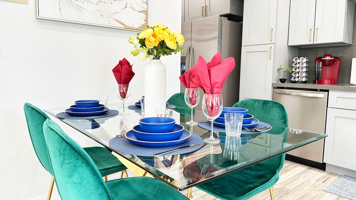 Welcome to our stylish 2-bedroom / 2.5-bathroom house with a balcony and backyard, perfect for your next getaway. Enjoy the open-plan living space with a 65-inch TV, a 10-foot ceiling plan, and a fully equipped kitchen. Both bedrooms have luxurious bedding for a restful night's sleep. Take in the stunning views from the balcony or relax in the backyard. Located in a peaceful neighborhood with nearby hiking trails, restaurants, and shopping, it is ideal for a romantic retreat or family vacation.