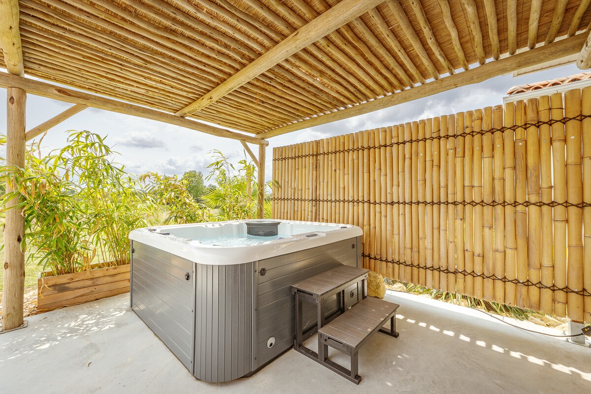 Dobro došli u našu nezavisnu gostinjsku kuću, udobno i intimno skrovište idealno za 2 gosta. Smeštena na našem imanju, ali potpuno privatna, koliba ima topao, minimalistički i egzotičan dekor inspirisan našim putovanjima. Okružen vinogradima i seoskim pejzažima, na pola puta između Bordoa i Sen Emiliona, savršeno je mesto za opuštanje i punjenje baterija. Smeštaj je klasifikovan sa 4 zvezdice.