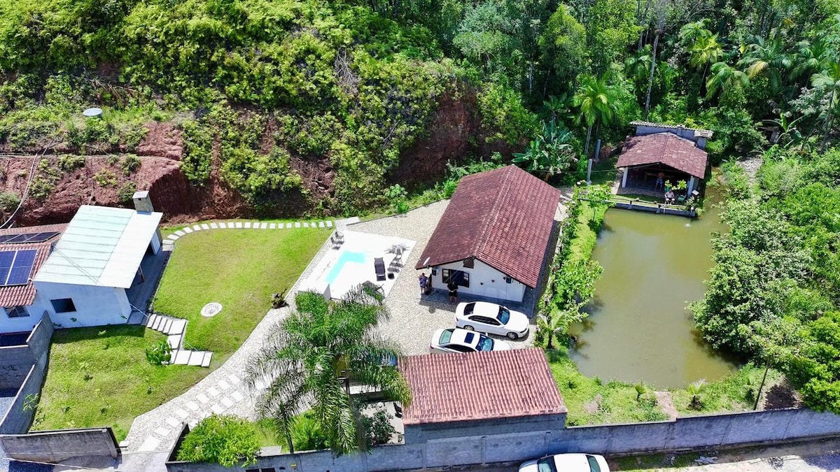 Casa de campo espaçosa e bem equipada, ideal para quem busca conforto, tranquilidade e bons momentos em grupo. Piscina aquecida, área gourmet com churrasqueira, fogão a lenha, mesa de ping pong e sinuca, além de um riacho nos fundos que completa o clima de descanso. Fácil acesso, a apenas 25 min do centro de Brusque. Também alugamos para pequenos eventos — consulte as condições.
