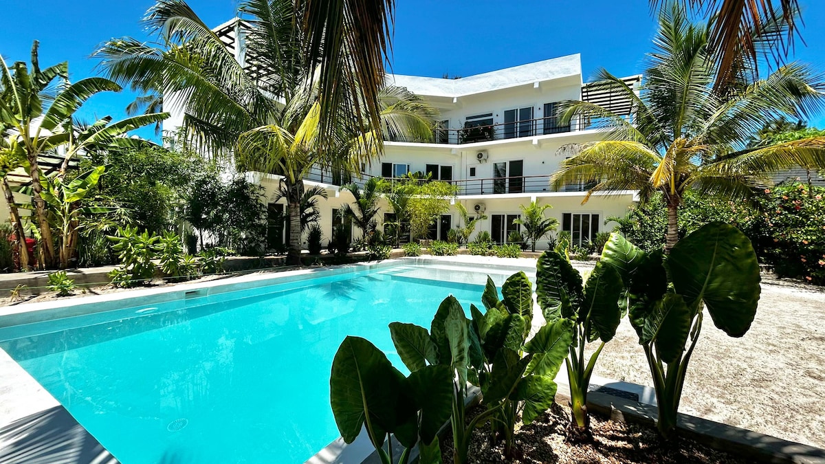 Opustite se u našim novoizgrađenim elegantnim stanovima. Uživajte u bazenu ispred svog privatnog stana ili prošetajte 7-8 minuta do obližnje plaže. Nalazimo se daleko od masovnog turizma, pa ako cijenite svoju privatnost, ovo bi bilo pravo mjesto. Idealno za mlade tek vjenčane parove! Možemo da organizujemo i safari na kopnu i jednodnevne izlete na Zanzibaru. Do prodavnica i supermarketa možete doći za 5 minuta automobilom ili mopedom. Ili ćemo vam rado dostaviti namirnice na kućni prag.
